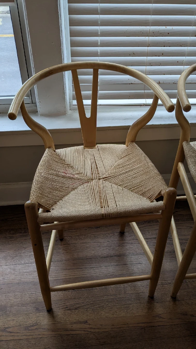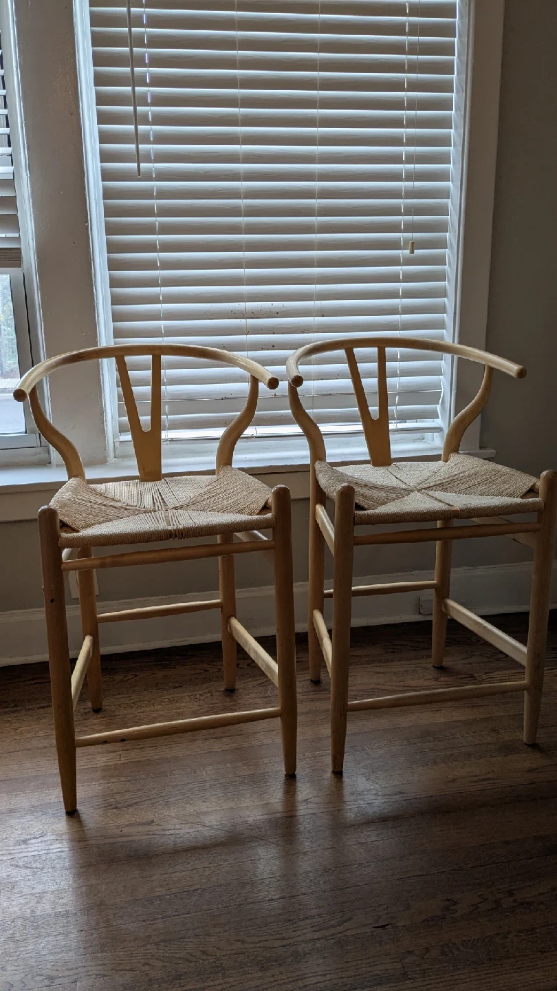 104Selling a pair of Wishbone chairs in the style of Hans Wegner! These chairs feature a natural woven seat and a classic, elegant design that would look great in any dining room or living space. They are sturdy and in good condition, perfect for adding a touch of mid-century modern style to your home.