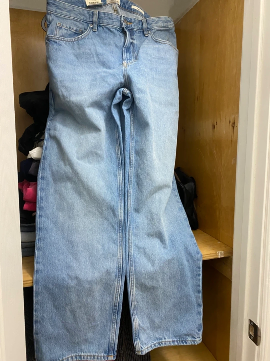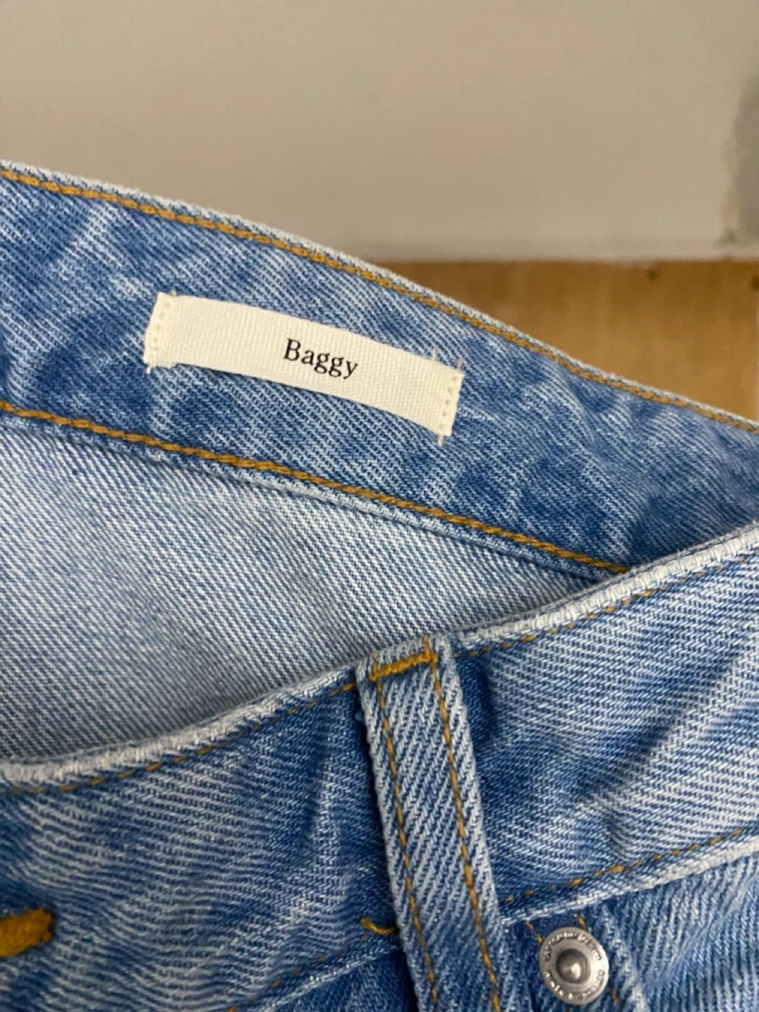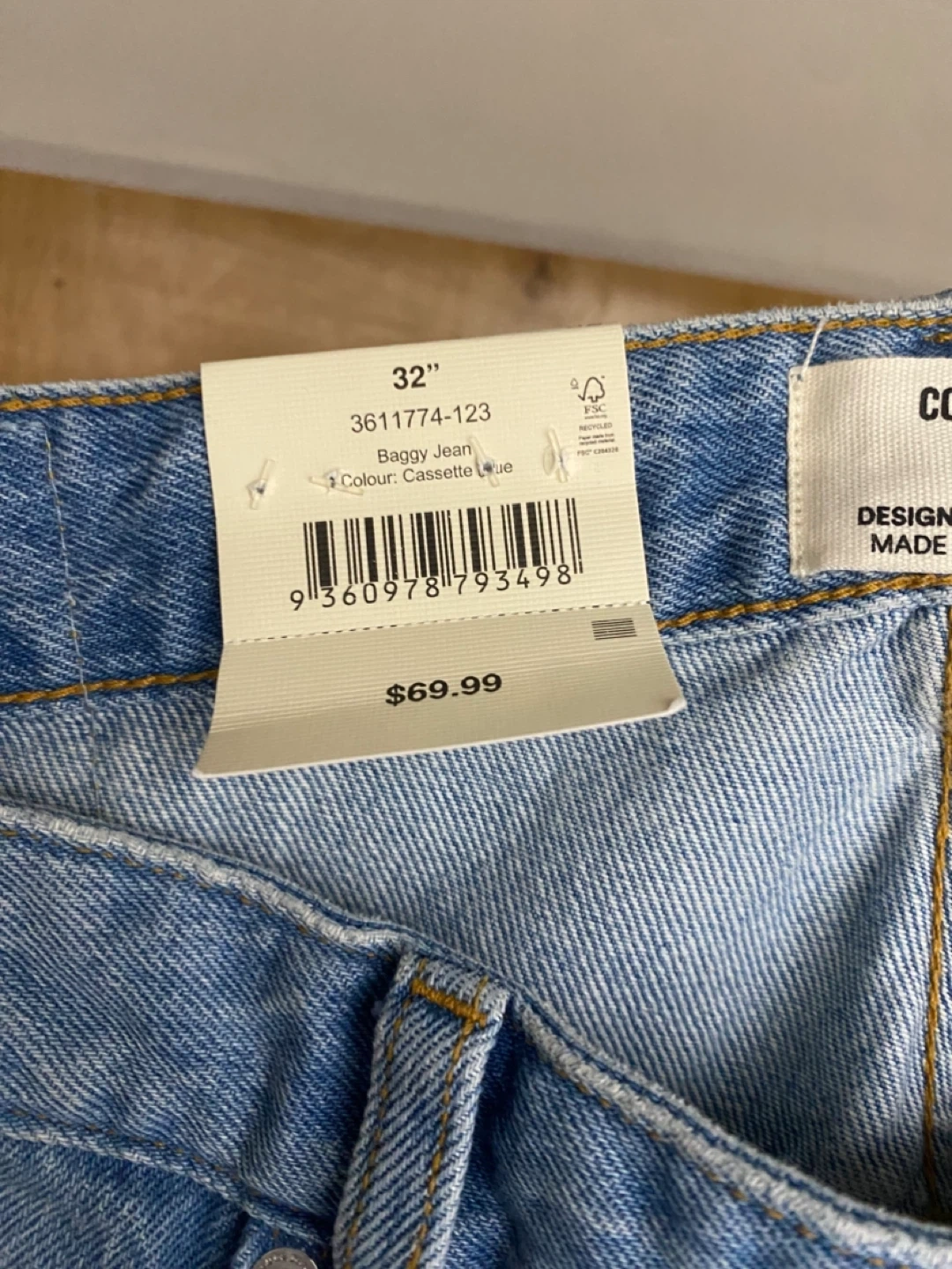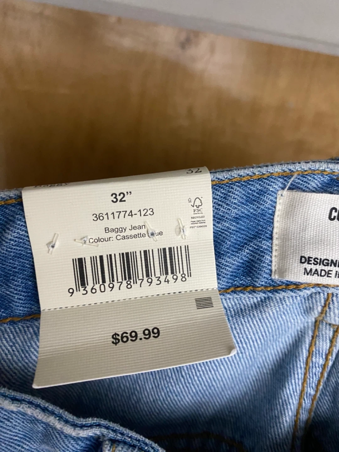 These are cotton-on baggy jeans in a Cassette Blue wash. They feature a 32" waist and are made of denim. This style offers a relaxed fit.