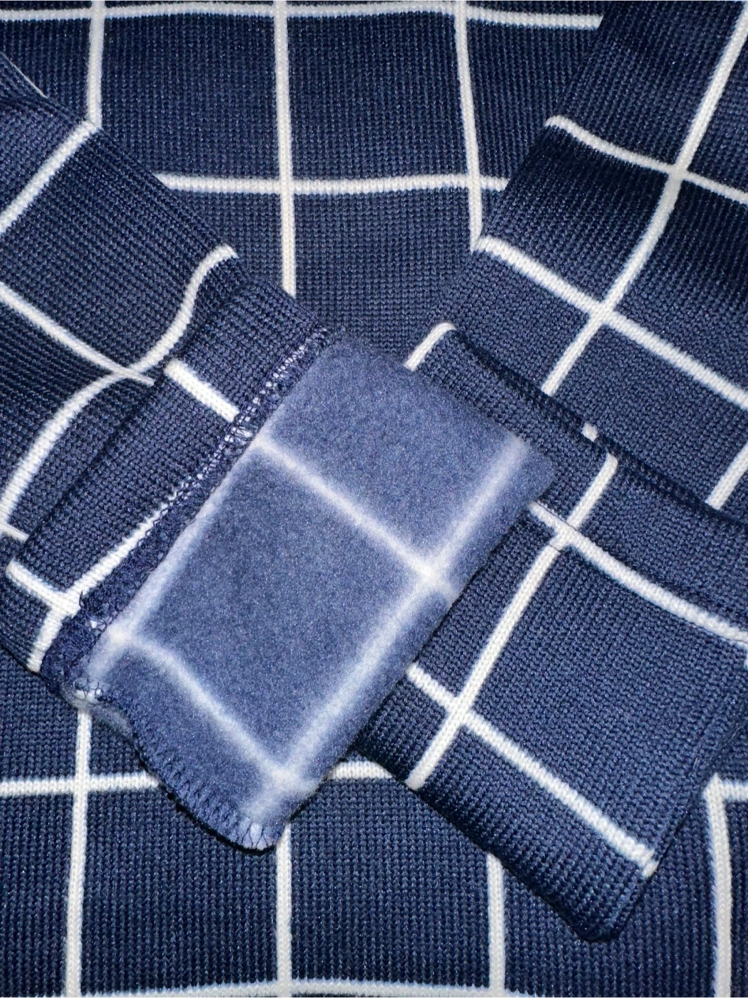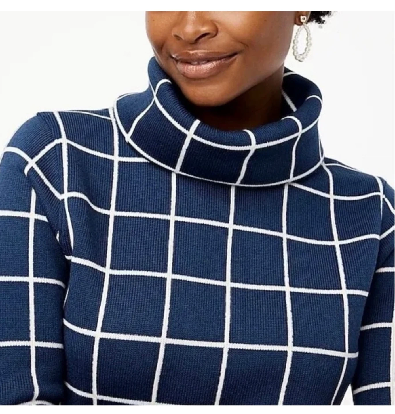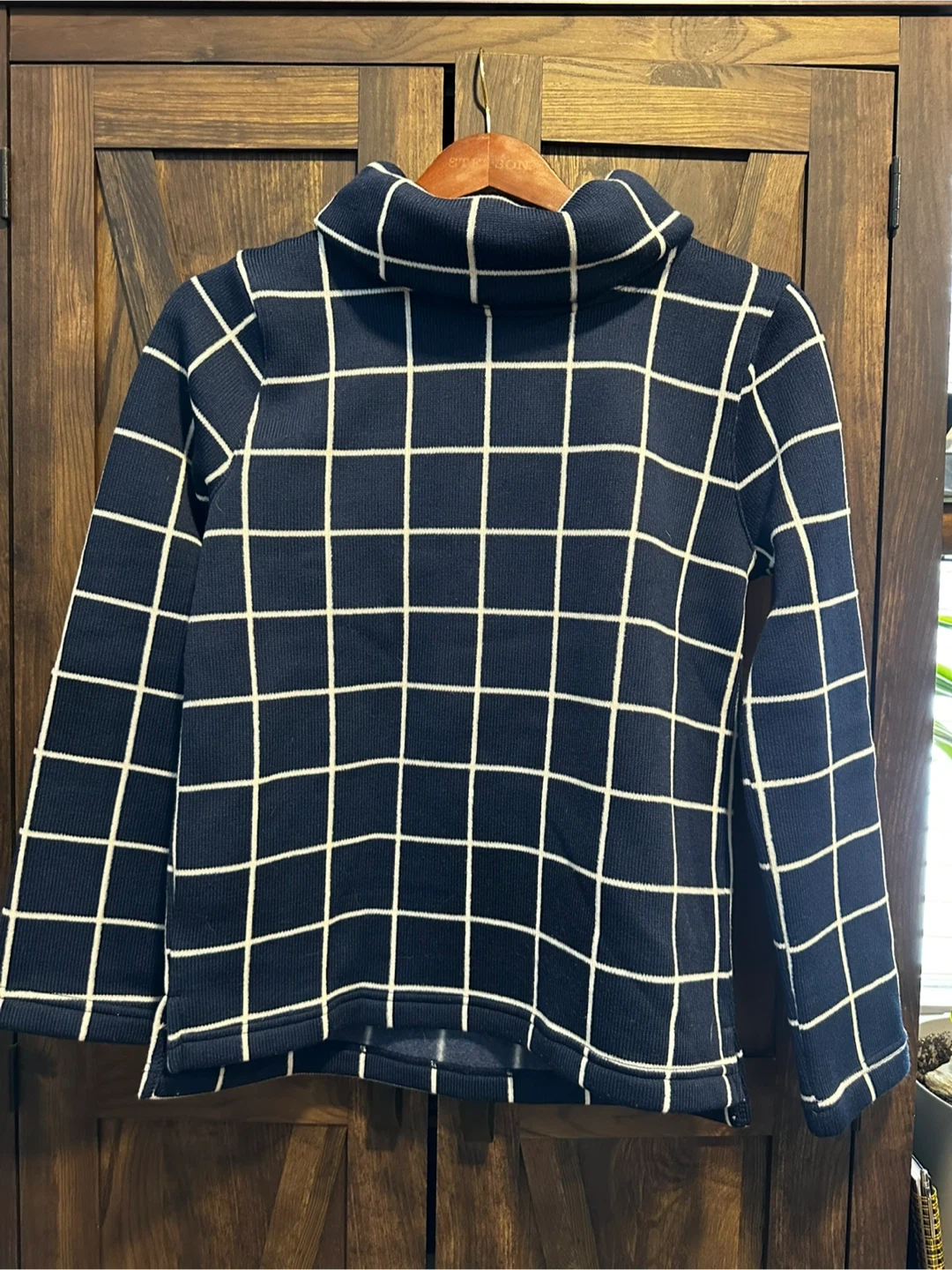 Like New, only worn a couple times. Beautiful Navy/White Windowpane pattern. Soft, fleecy lining. This sweater is WARM.