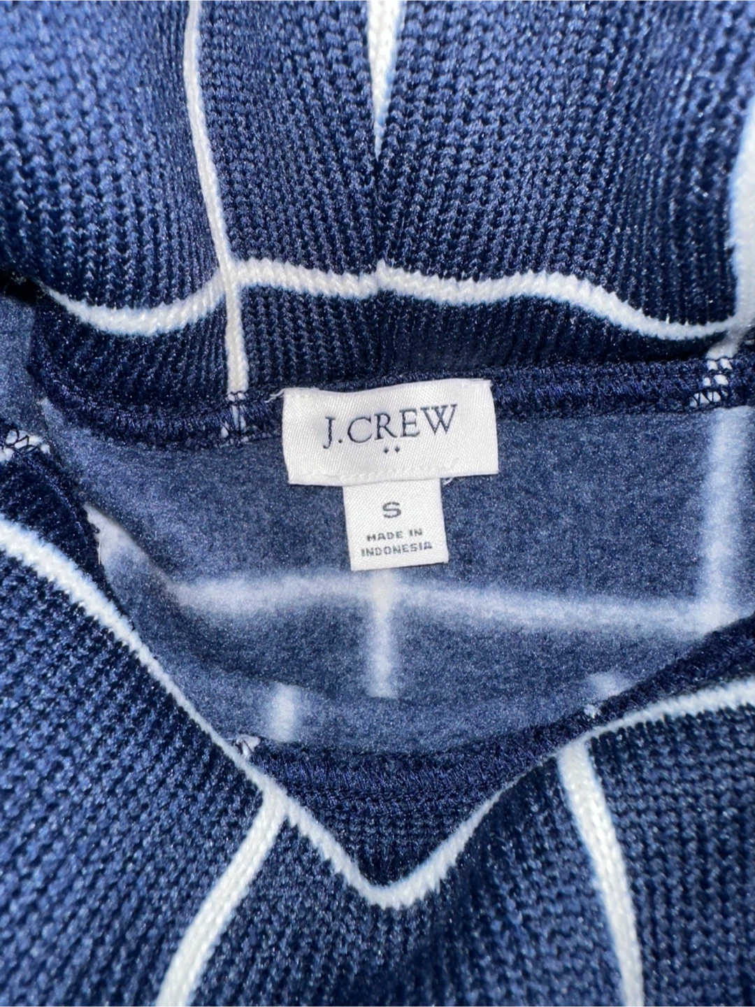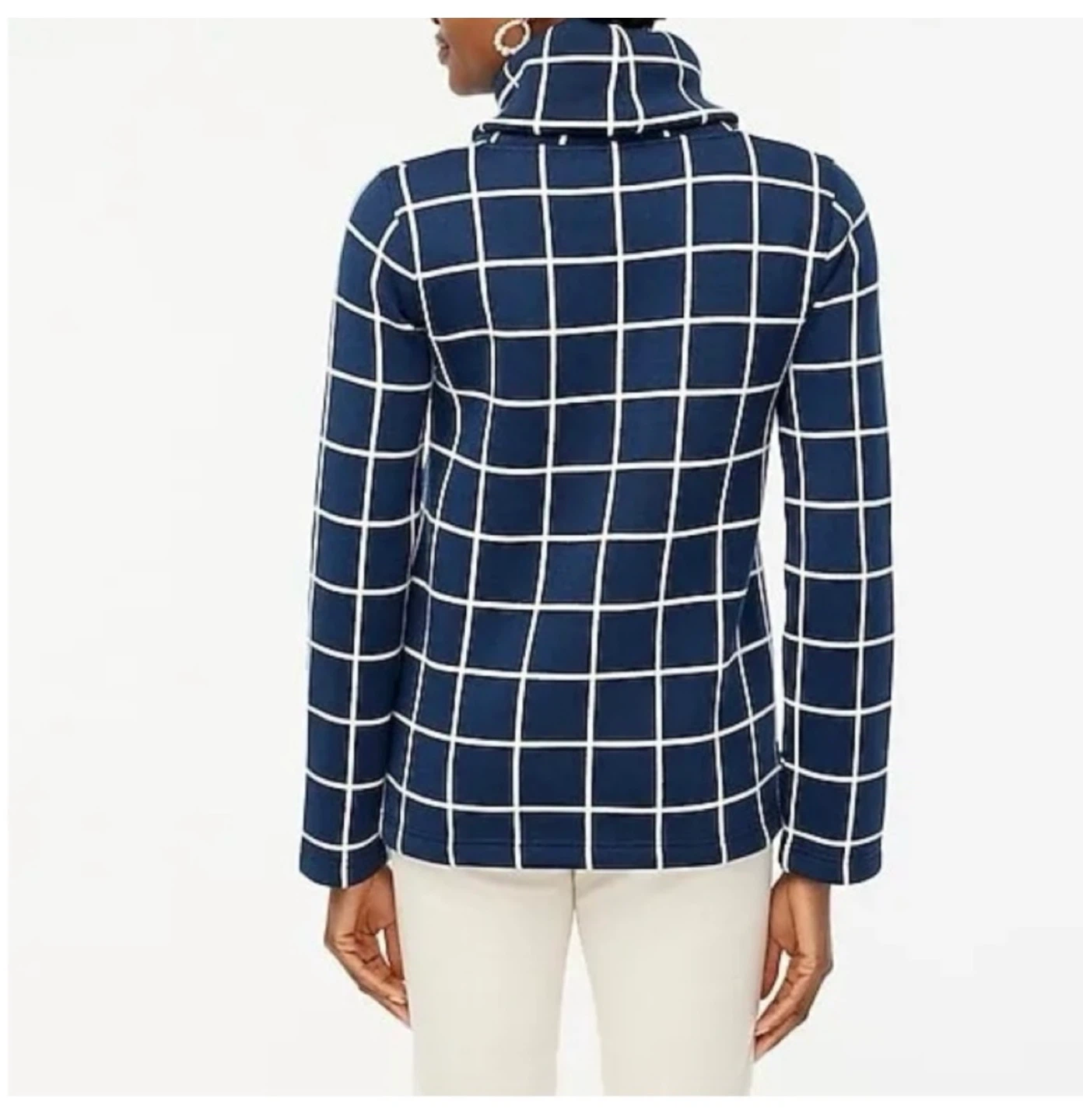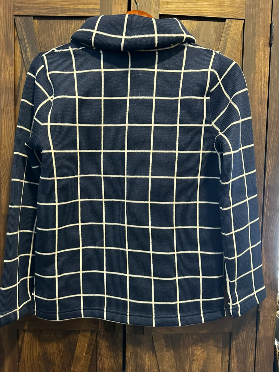 Like New, only worn a couple times. Beautiful Navy/White Windowpane pattern. Soft, fleecy lining. This sweater is WARM.
