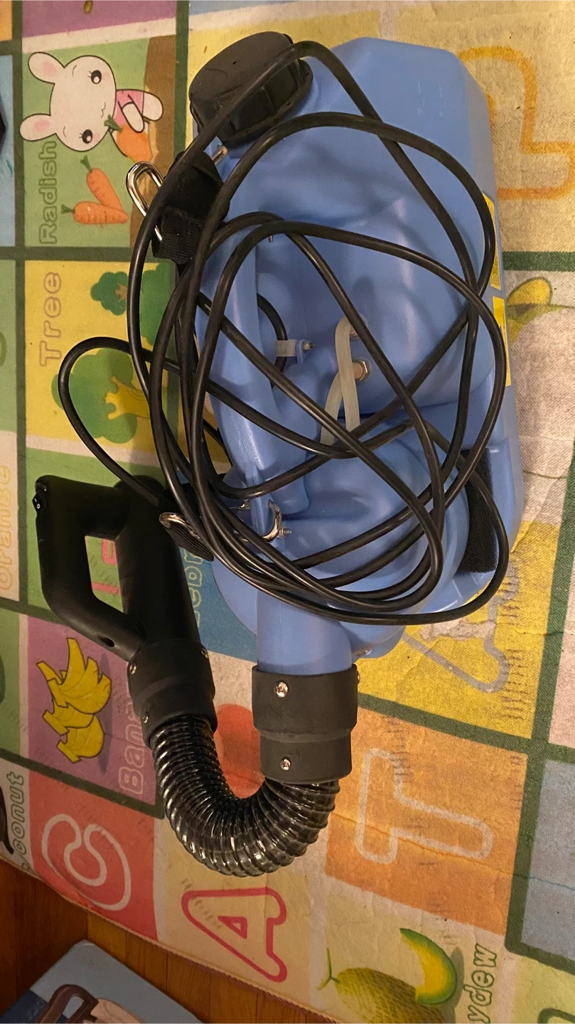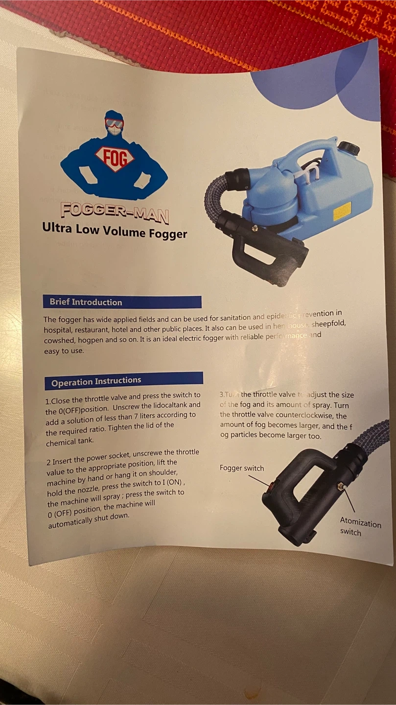 This is a FOGGER-MAN Ultra Low Volume electric fogger. It's blue and includes the sprayer nozzle and hose assembly. This device is suitable for sanitation and epidemic prevention in various locations.
