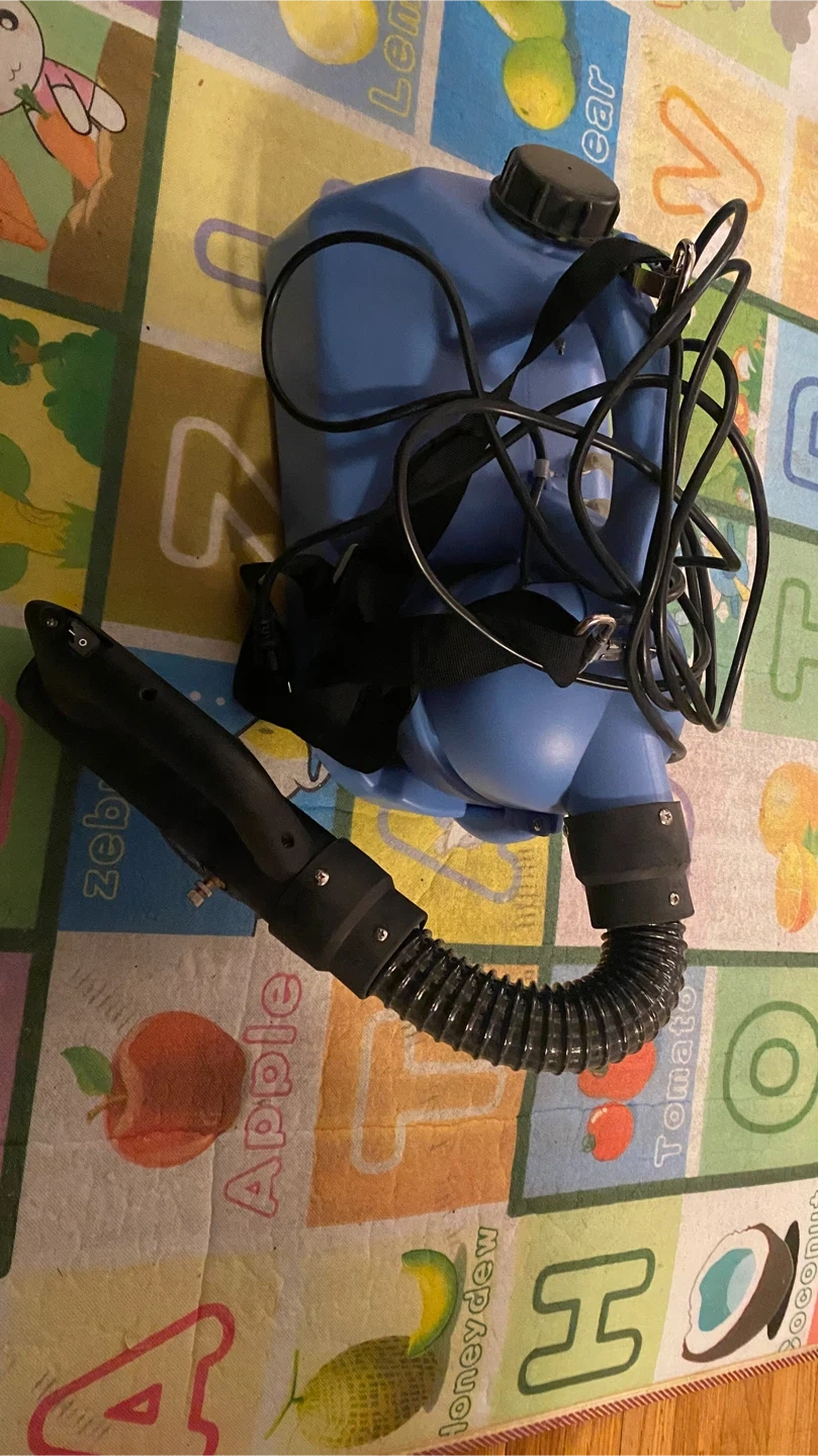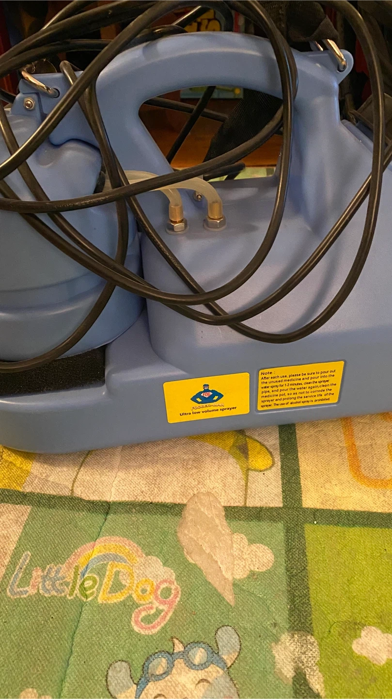 This is a FOGGER-MAN Ultra Low Volume electric fogger. It's blue and includes the sprayer nozzle and hose assembly. This device is suitable for sanitation and epidemic prevention in various locations.