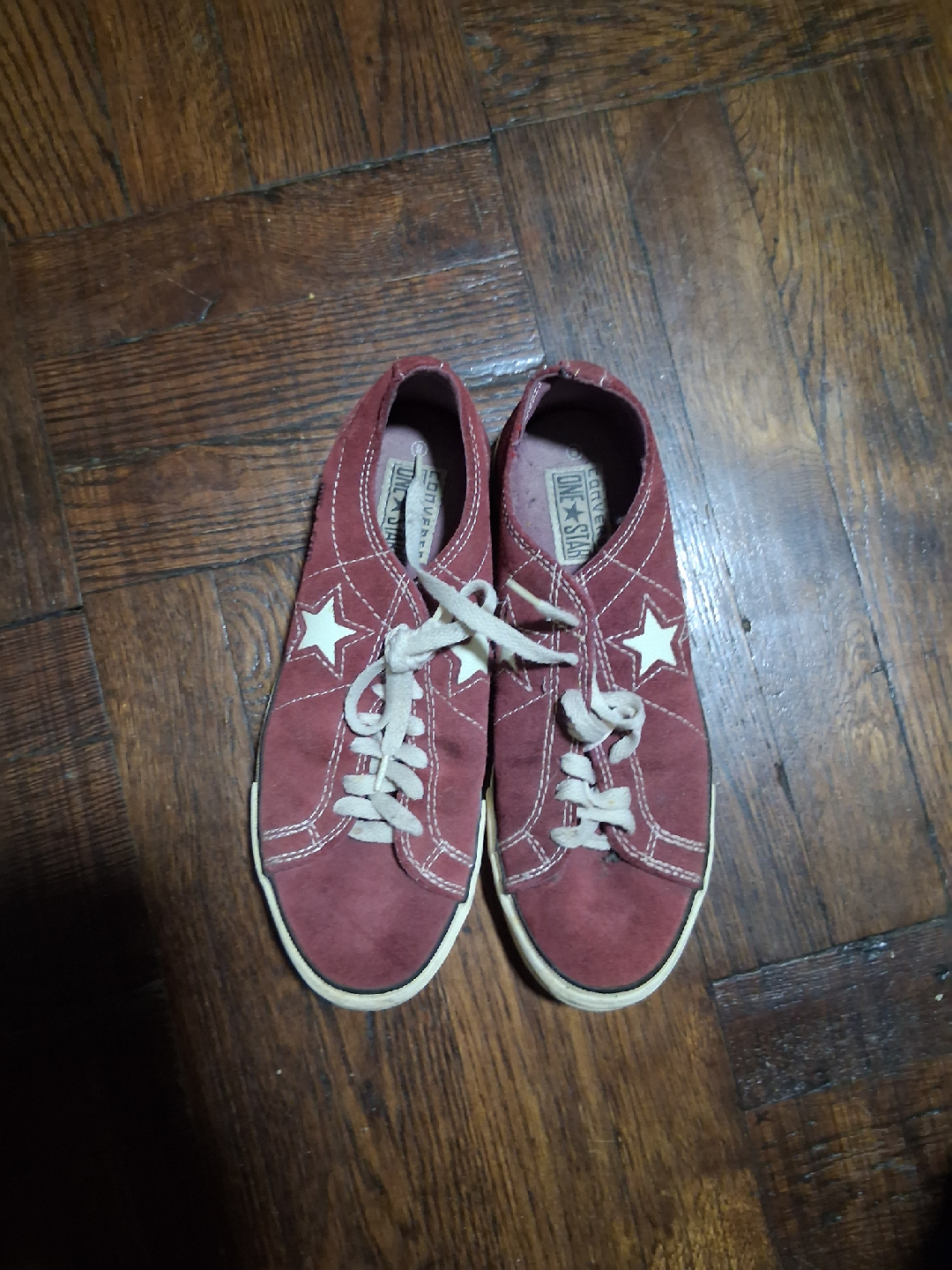 Selling a pair of Converse One Star low sneakers in maroon. They have a white star design on the side and white laces. They are in used condition.