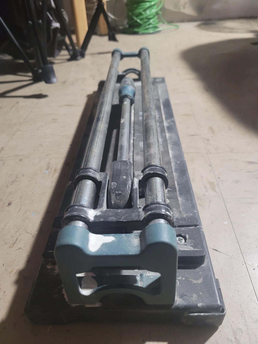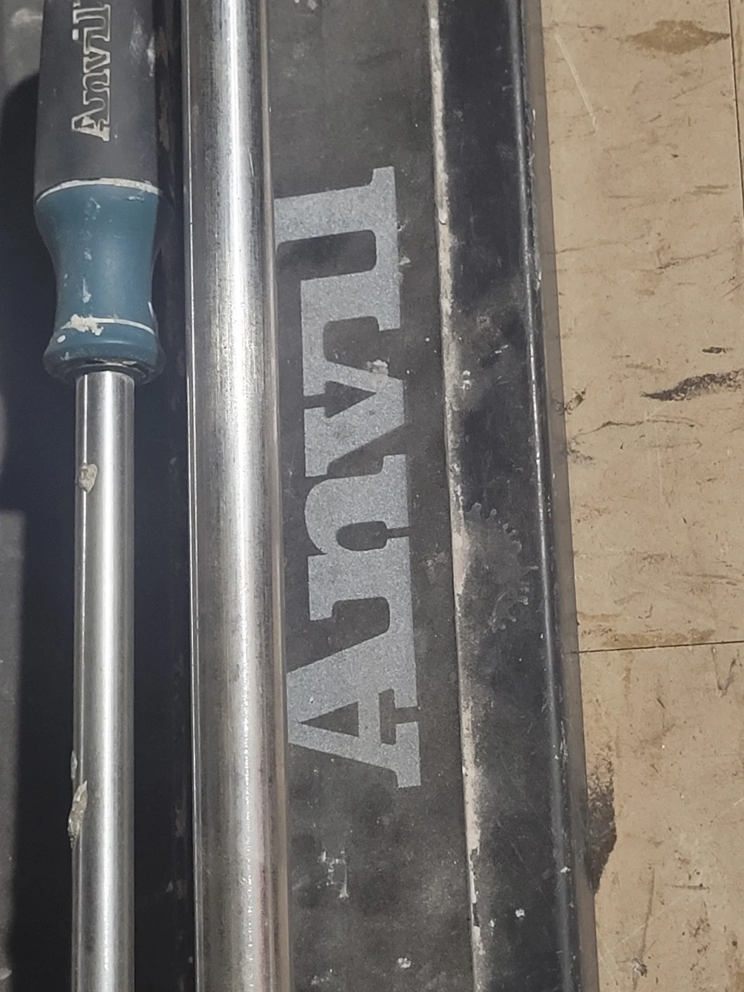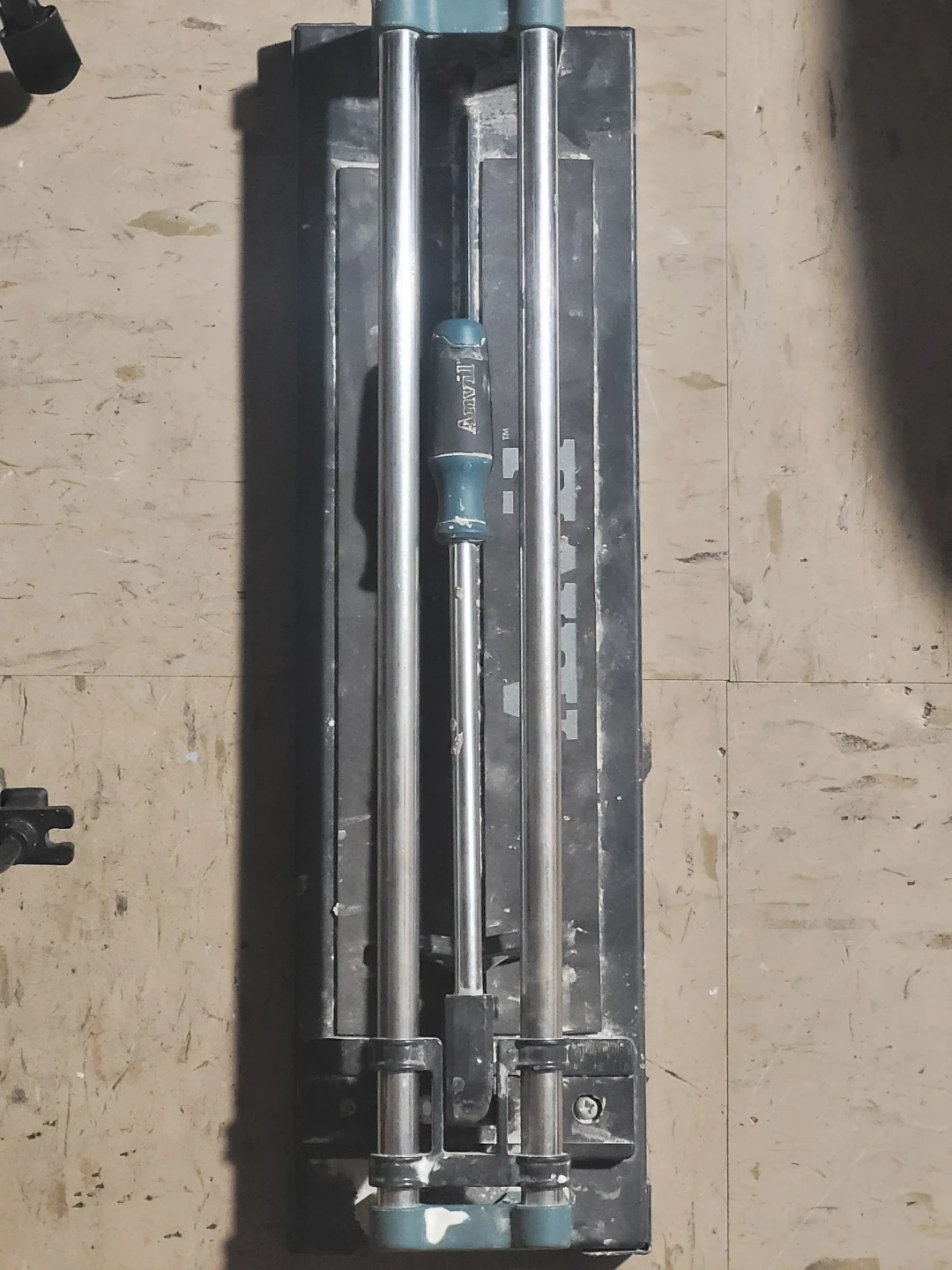 This is an Anvil brand tile cutter. It features dual chrome-plated steel rails for smooth operation. It's a robust tool for cutting various tiles.