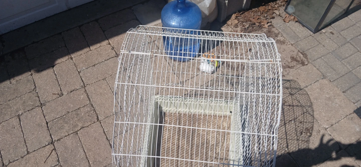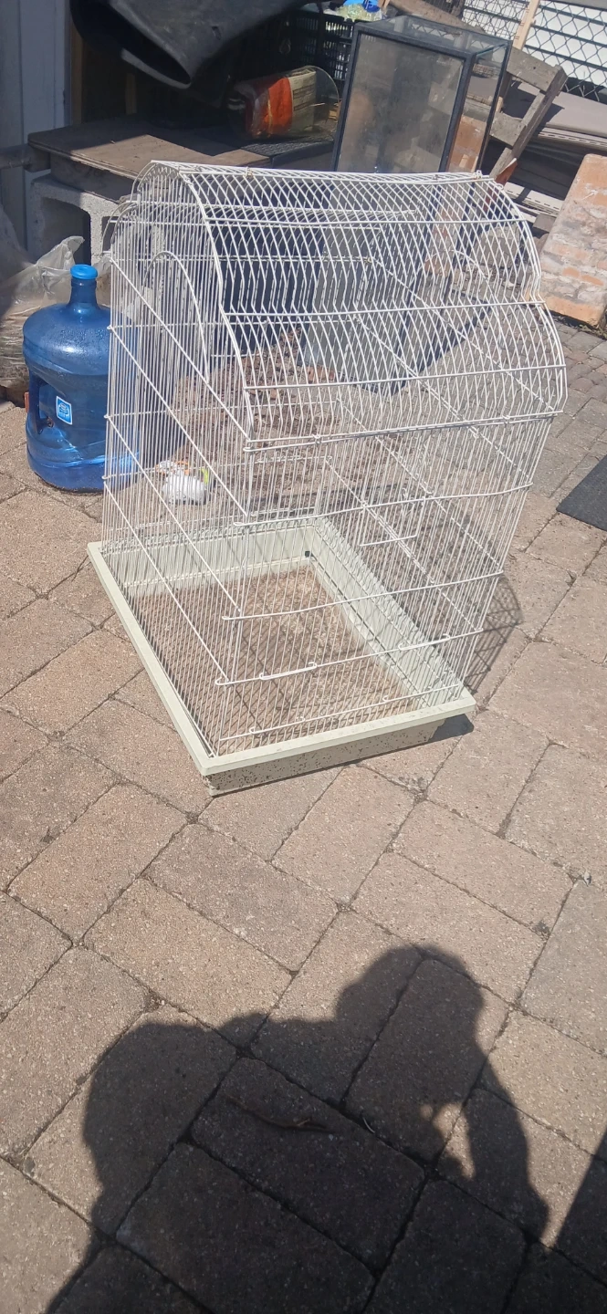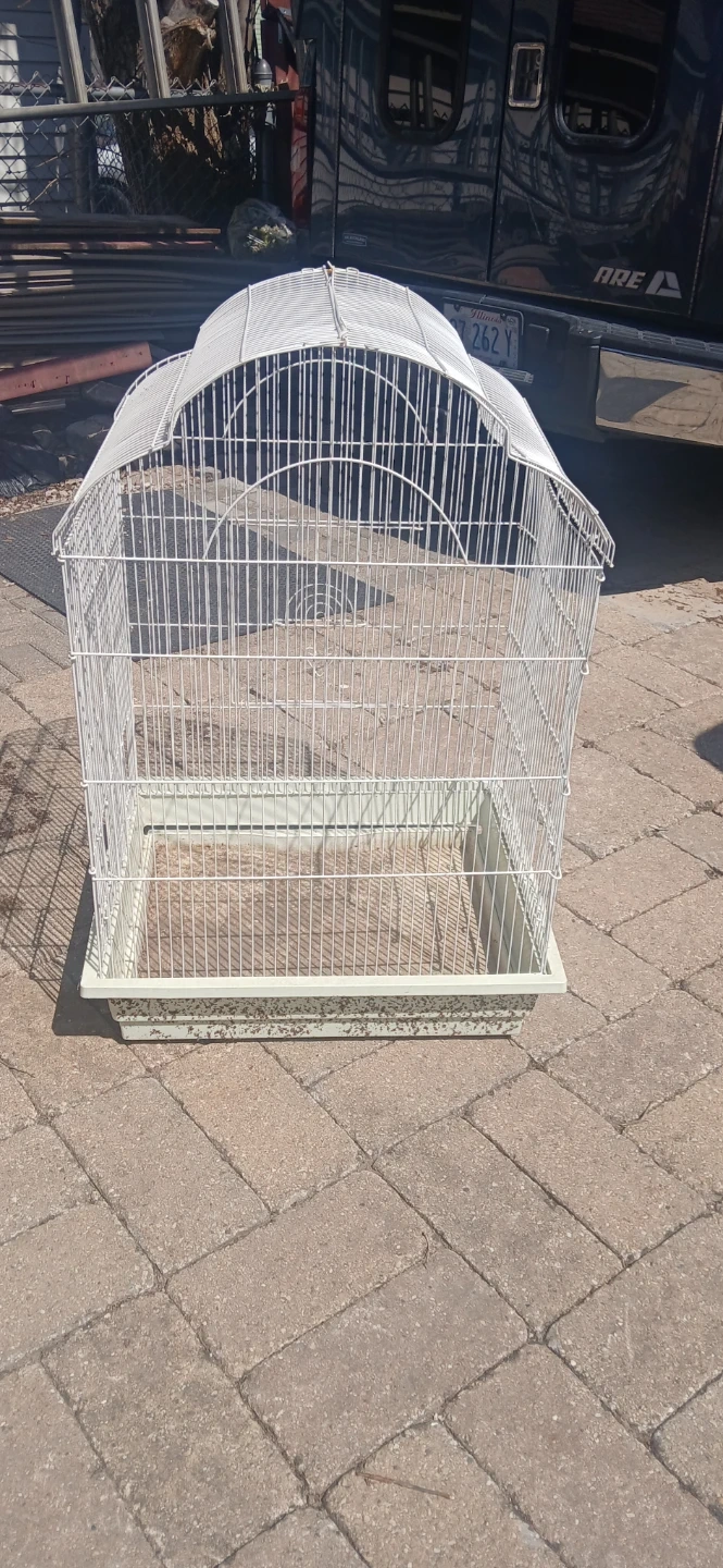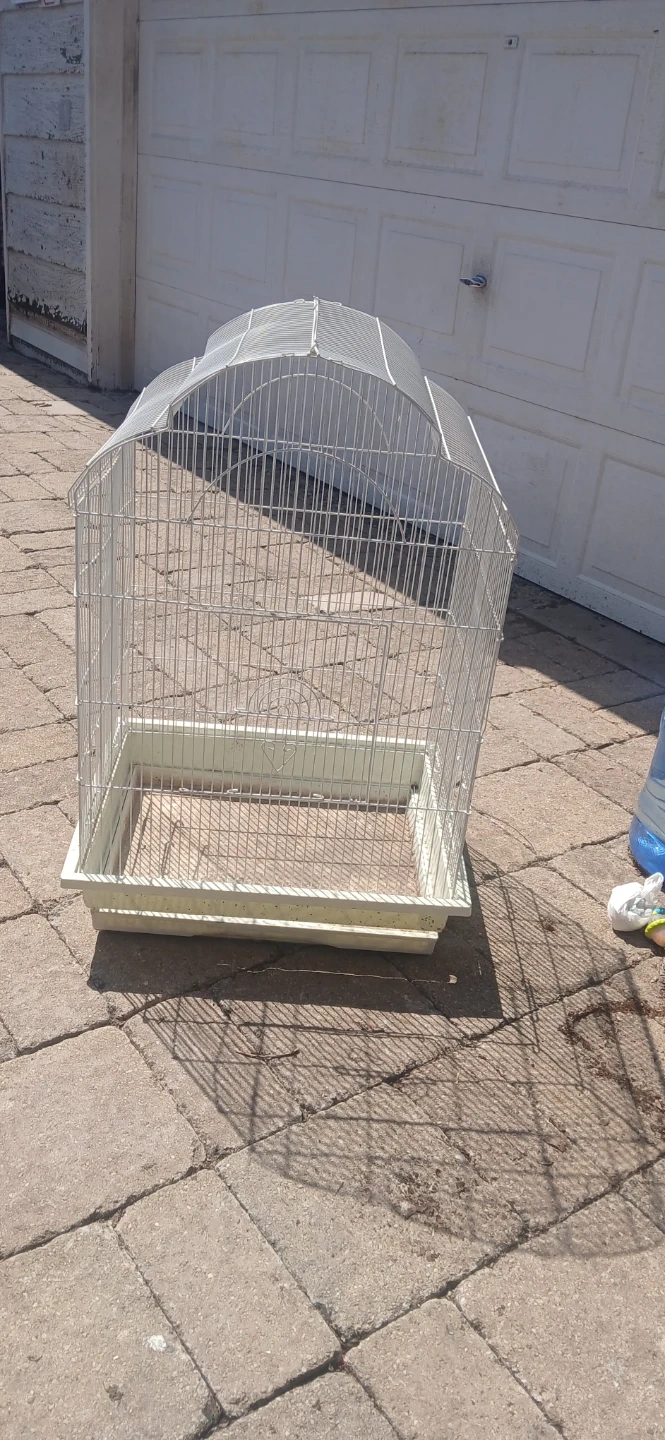 This is a white wire bird cage with a light green plastic base. It has a domed top and plenty of space for birds. The base is designed for easy cleaning. It's suitable for small to medium-sized birds. I used it for baby chickens only.