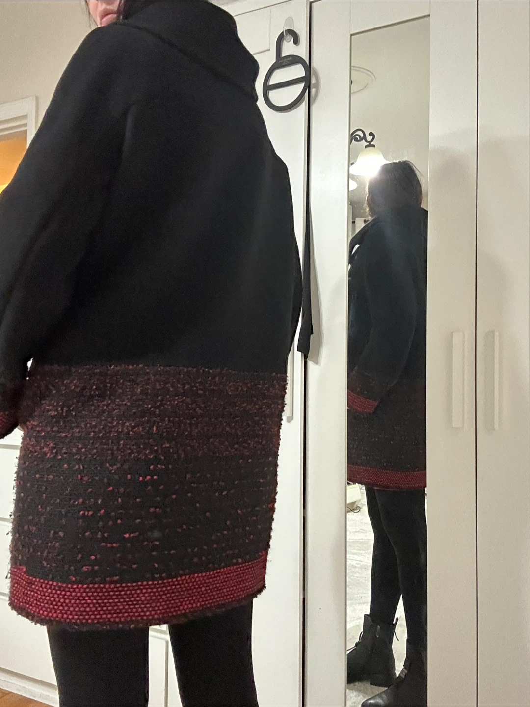 Selling a stylish black redcoat in size M! It's made from a wool blend, perfect for staying warm. The coat features a unique design with a red and black textured pattern at the bottom and cuffs. Great for adding a touch of elegance to your wardrobe!