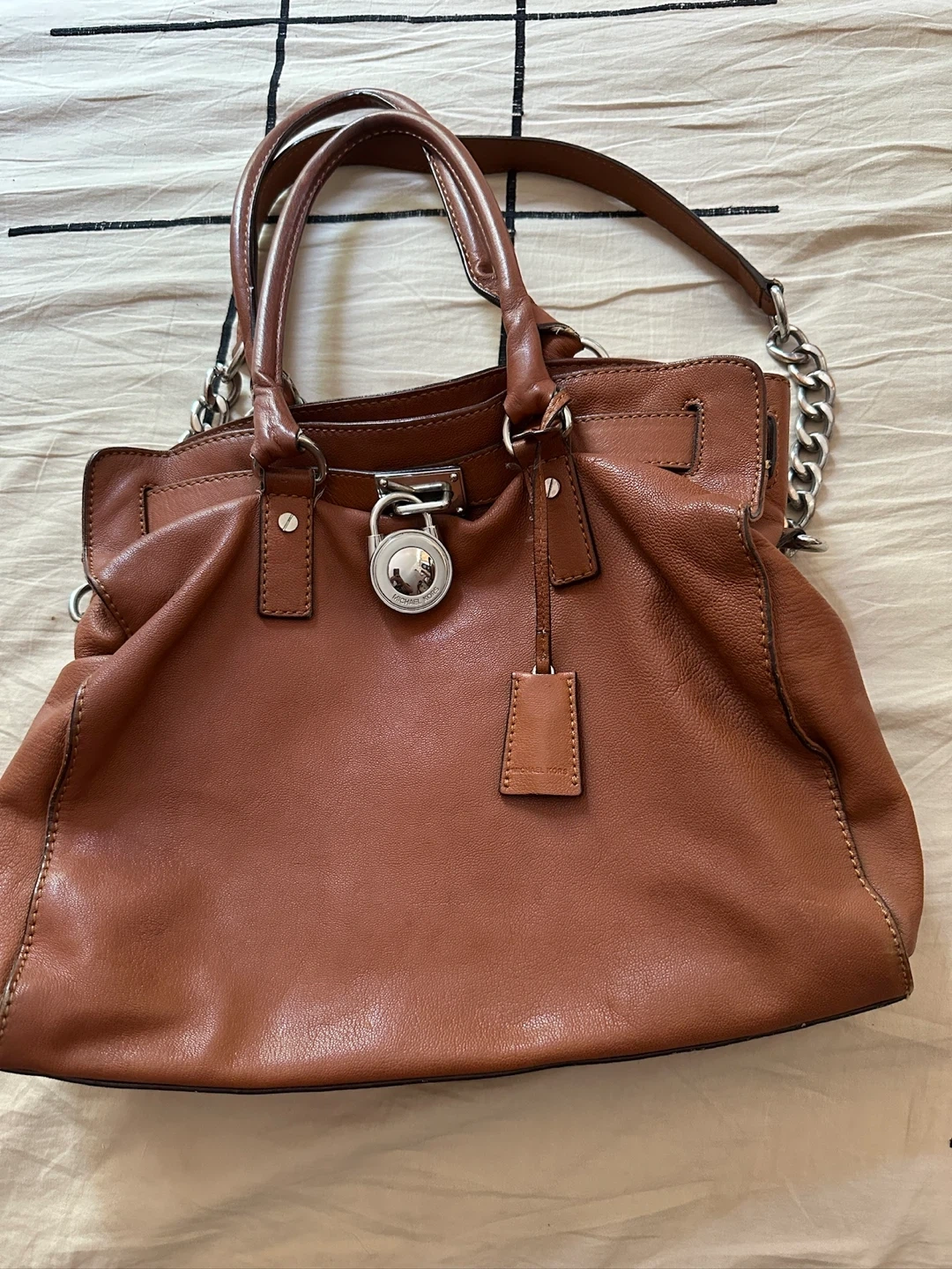 Selling a Michael Kors leather satchel in good condition! It features a lock detail and chain accents. The bag is a beautiful brown color and perfect for everyday use