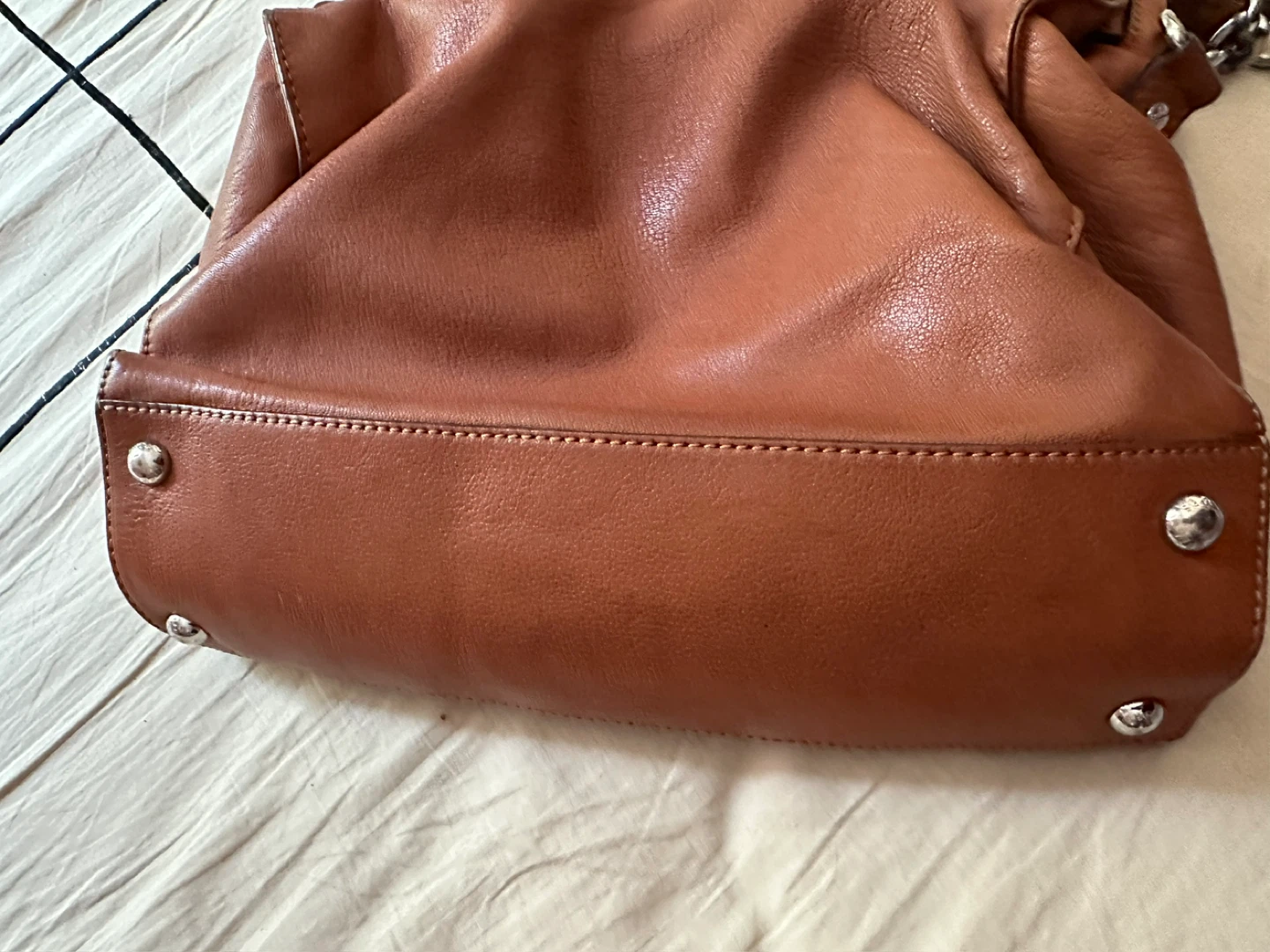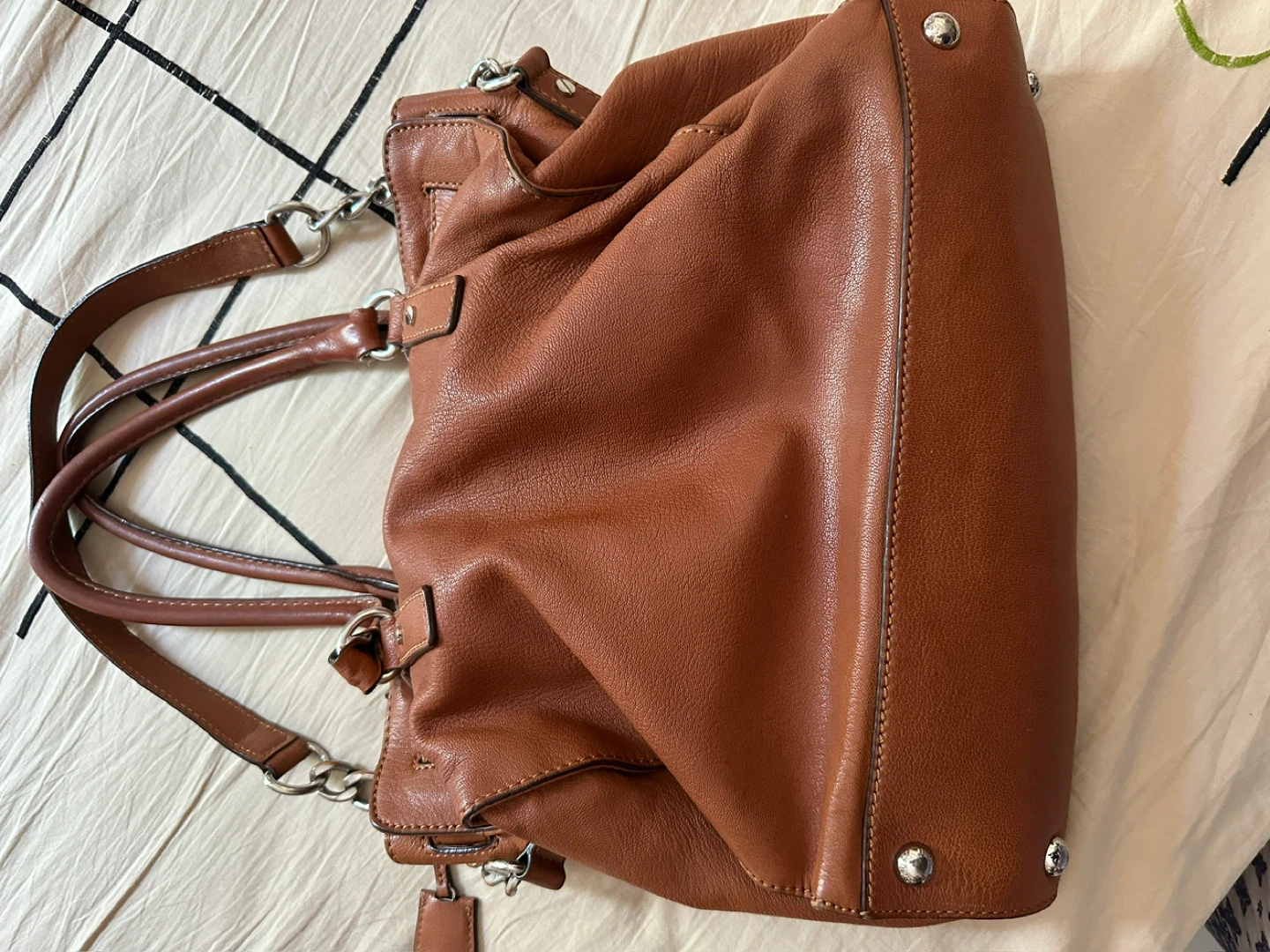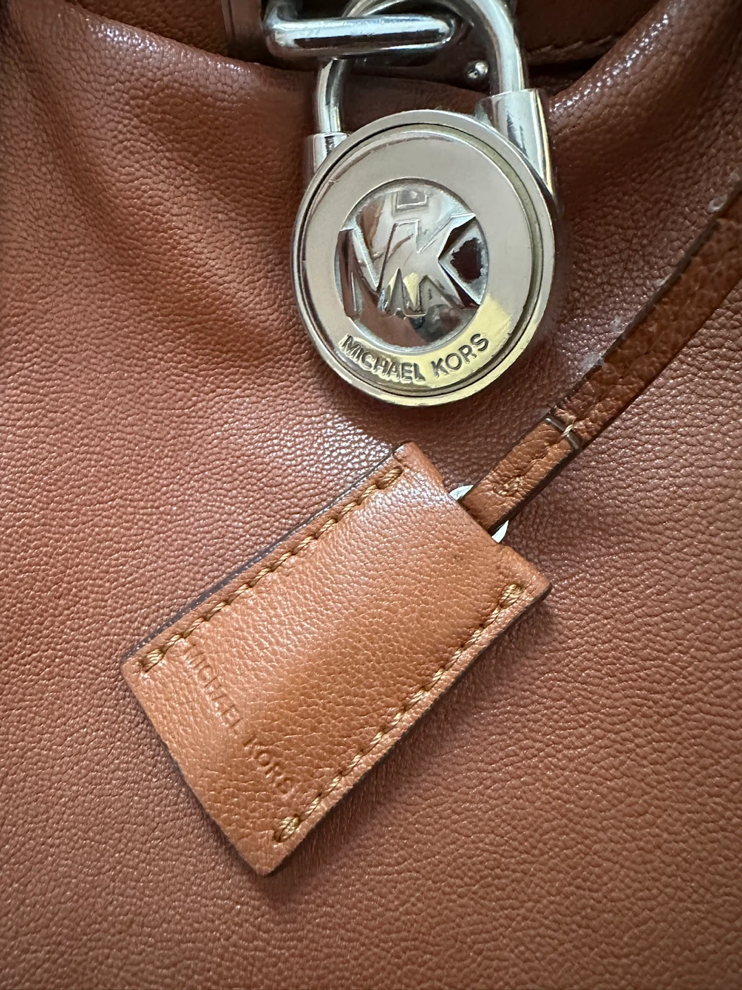 Selling a Michael Kors leather satchel in good condition! It features a lock detail and chain accents. The bag is a beautiful brown color and perfect for everyday use