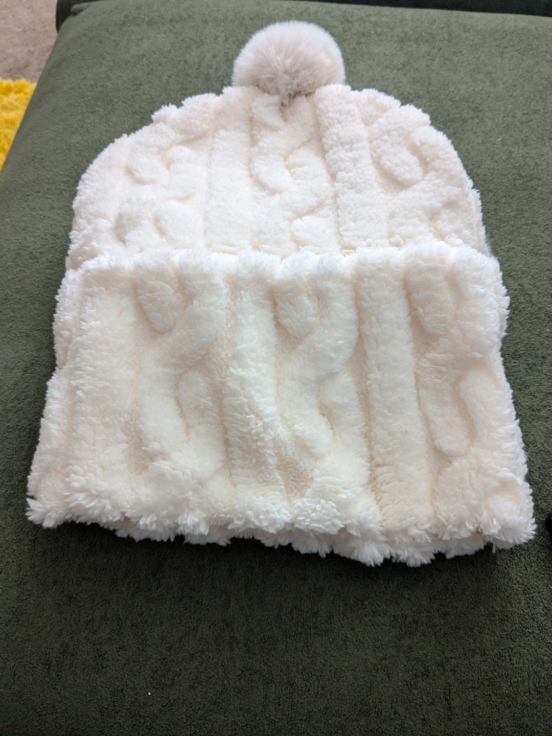 Faux Fur Trim Hat: A comfortable, warm knit beanie featuring a wide, plush faux fur brim that sits snugly around the forehead and ears. It's topped with a matching pom-pom detail, adding a playful and luxurious touch.