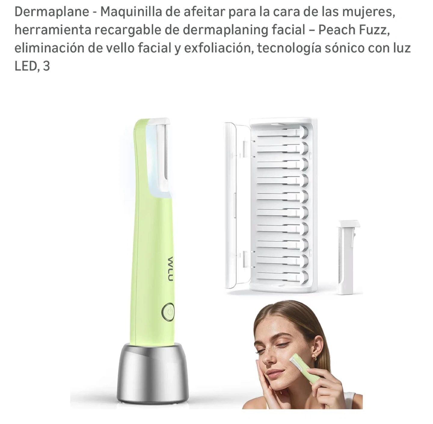 60I'm selling a WLU rechargeable dermaplaning facial razor! It removes peach fuzz and dead skin in one glide, leaving your skin smooth and radiant. The sonic-powered blade is fast, safe, and precise, and the built-in LED light ensures a smooth, flawless finish. The box includes: - 1 box of 10 replacement blades - Charging cable - Cleaning brush - Charging base