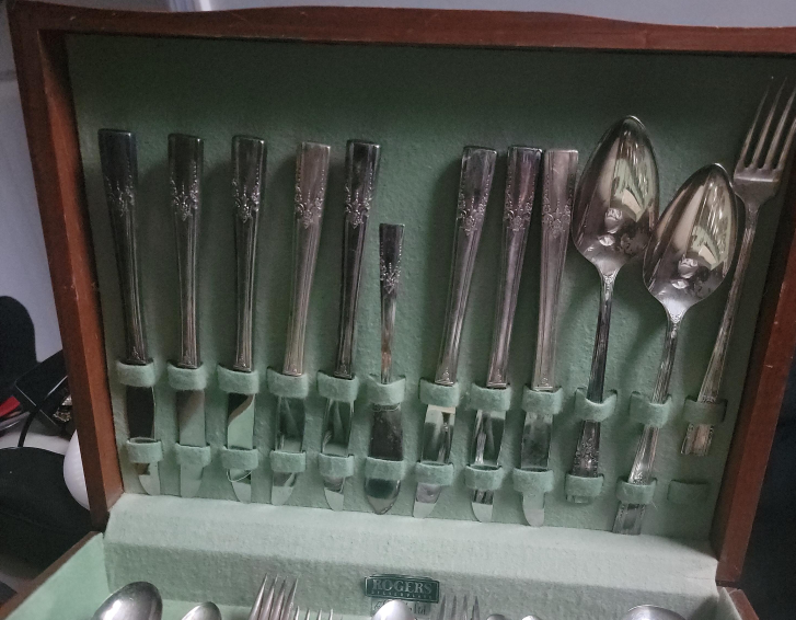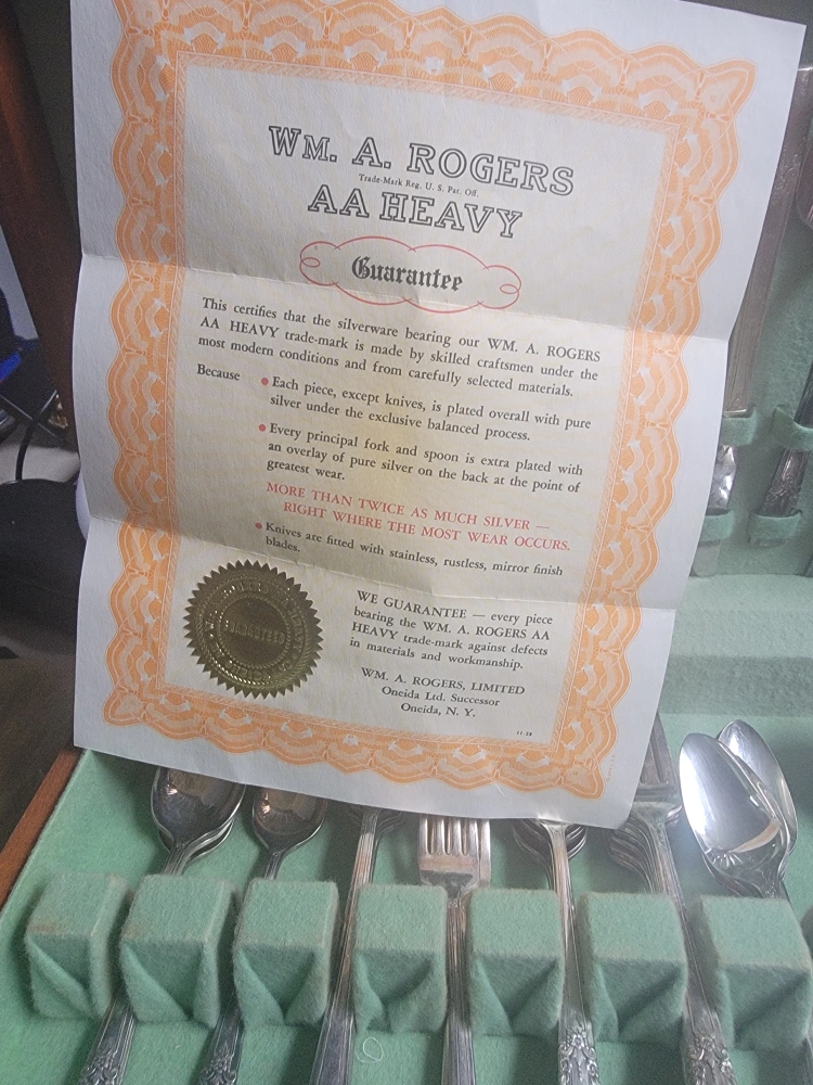 Selling a Wm. A. Rogers AA Heavy silverware set. This set is made by skilled craftsmen using modern methods and carefully selected materials. Each piece, except the knives, is plated with pure silver using an exclusive balanced process. The principal fork and spoon are extra plated with an overlay of pure silver on the back at the point of greatest wear. Knives are fitted with stainless, rustless, mirror finish blades
