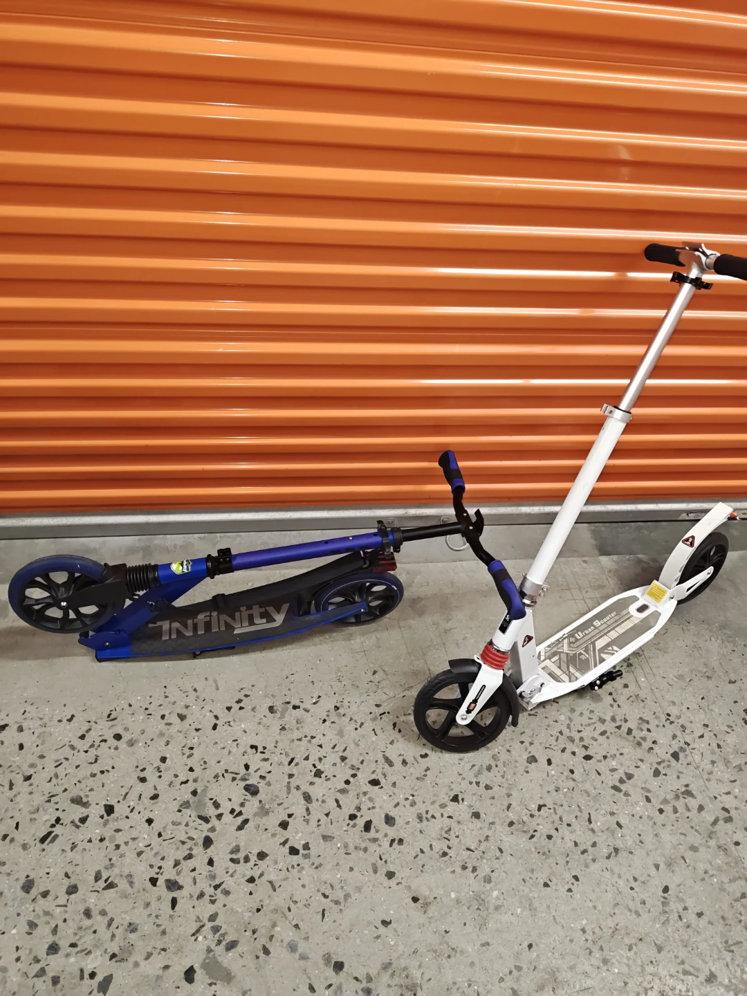 This listing includes two scooters. One is blue and branded "Infinity". The other is white and says "Urban Scooter" on the deck. Both appear to be foldable models.