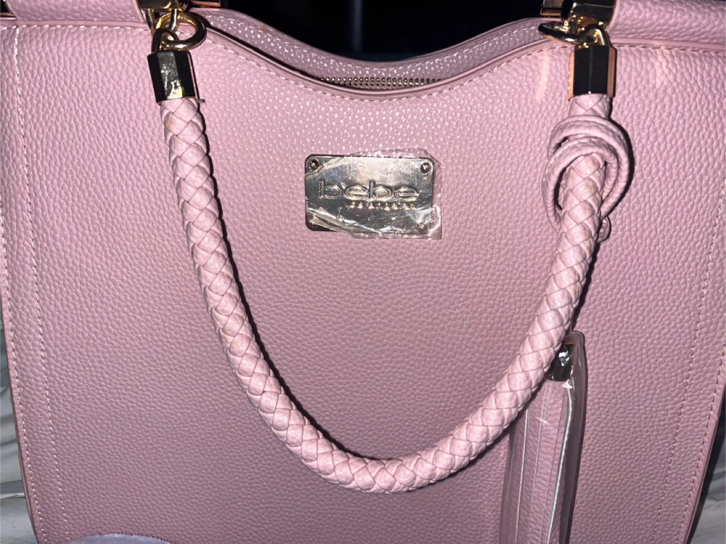 This is a cute pink tote bag from Bebe. It has braided handles and a zip closure. The faux leather material gives it a nice texture.