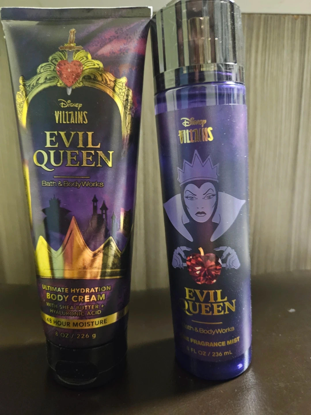 This set includes an Evil Queen Ultimate Hydration Body Cream and a Fine Fragrance Mist. The body cream provides 48-hour moisture with shea butter and hyaluronic acid. Both items are from Bath & Body Works and feature Disney Villains designs.