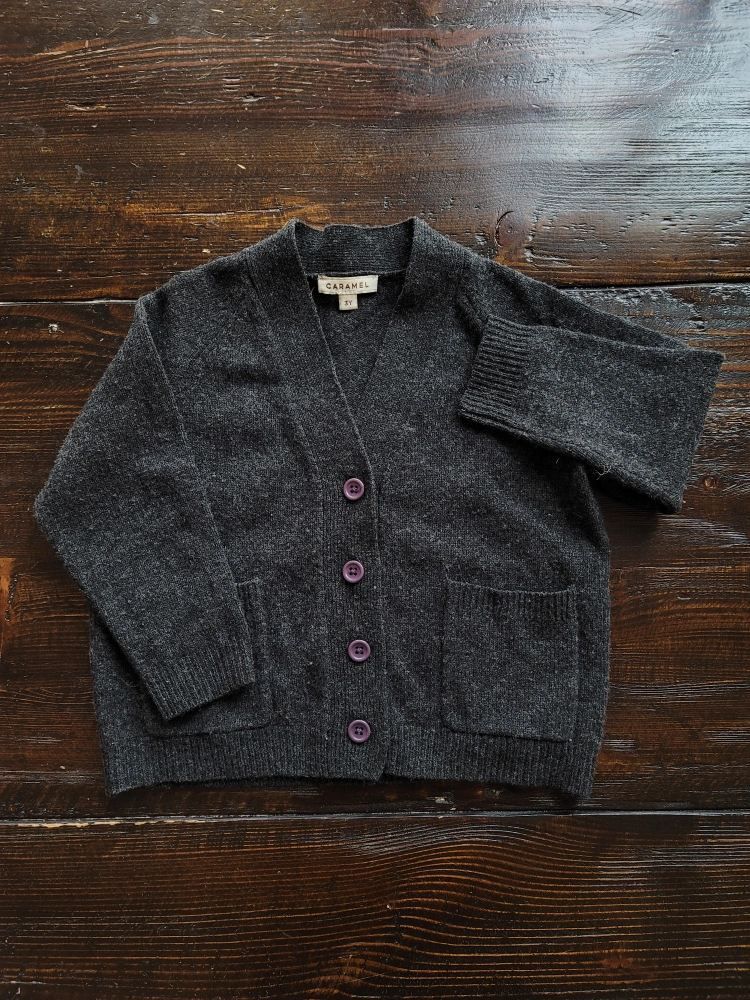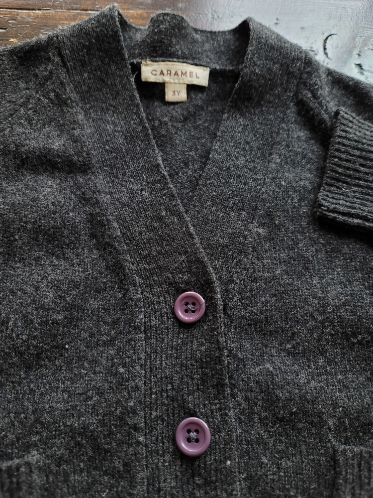 Dark gray children's wool cardigan. Soft material. Features pockets and purple buttons. Size 3Y.