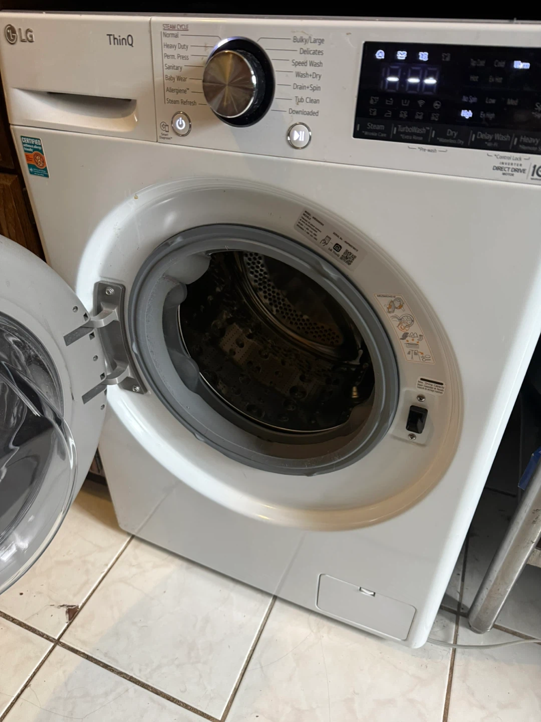 This is an LG ThinQ washer/dryer combo. It's a white front-load model with a large capacity drum. Features include various steam cycles for different fabric types.