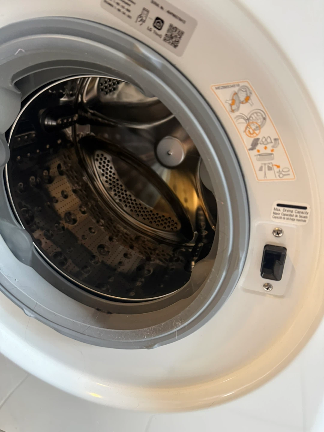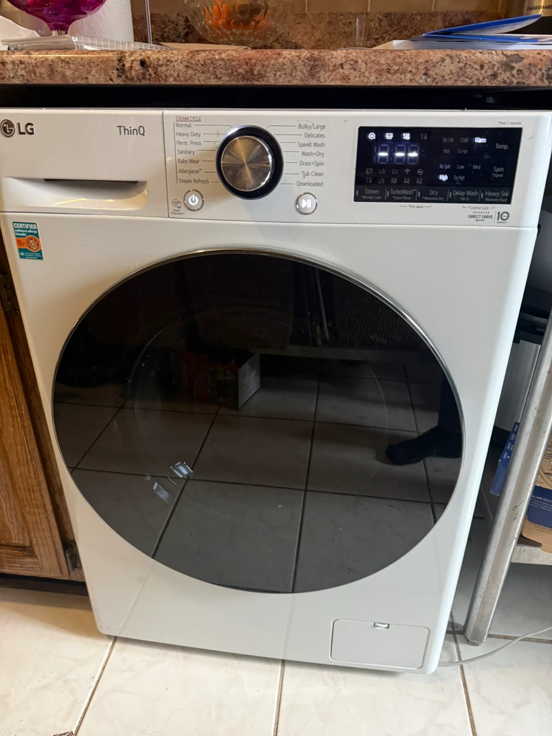 This is an LG ThinQ washer/dryer combo. It's a white front-load model with a large capacity drum. Features include various steam cycles for different fabric types.