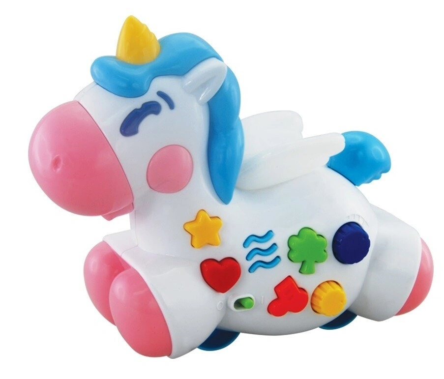 This adorable light-up unicorn toy is sure to delight! It features various buttons with different shapes like a star, heart, and tree, along with sound effects and lights. Perfect for keeping little ones entertained