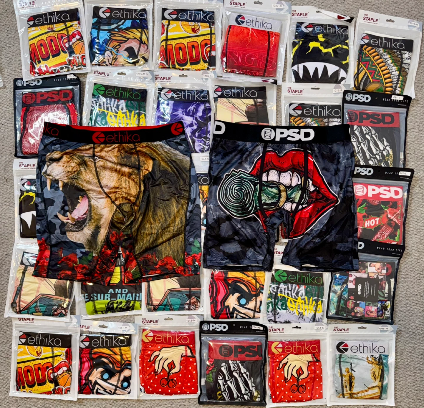 This listing includes assorted boxer briefs from Ethika and PSD. Designs feature bold graphics and various prints. Primarily made of soft, stretchy fabric for comfort.