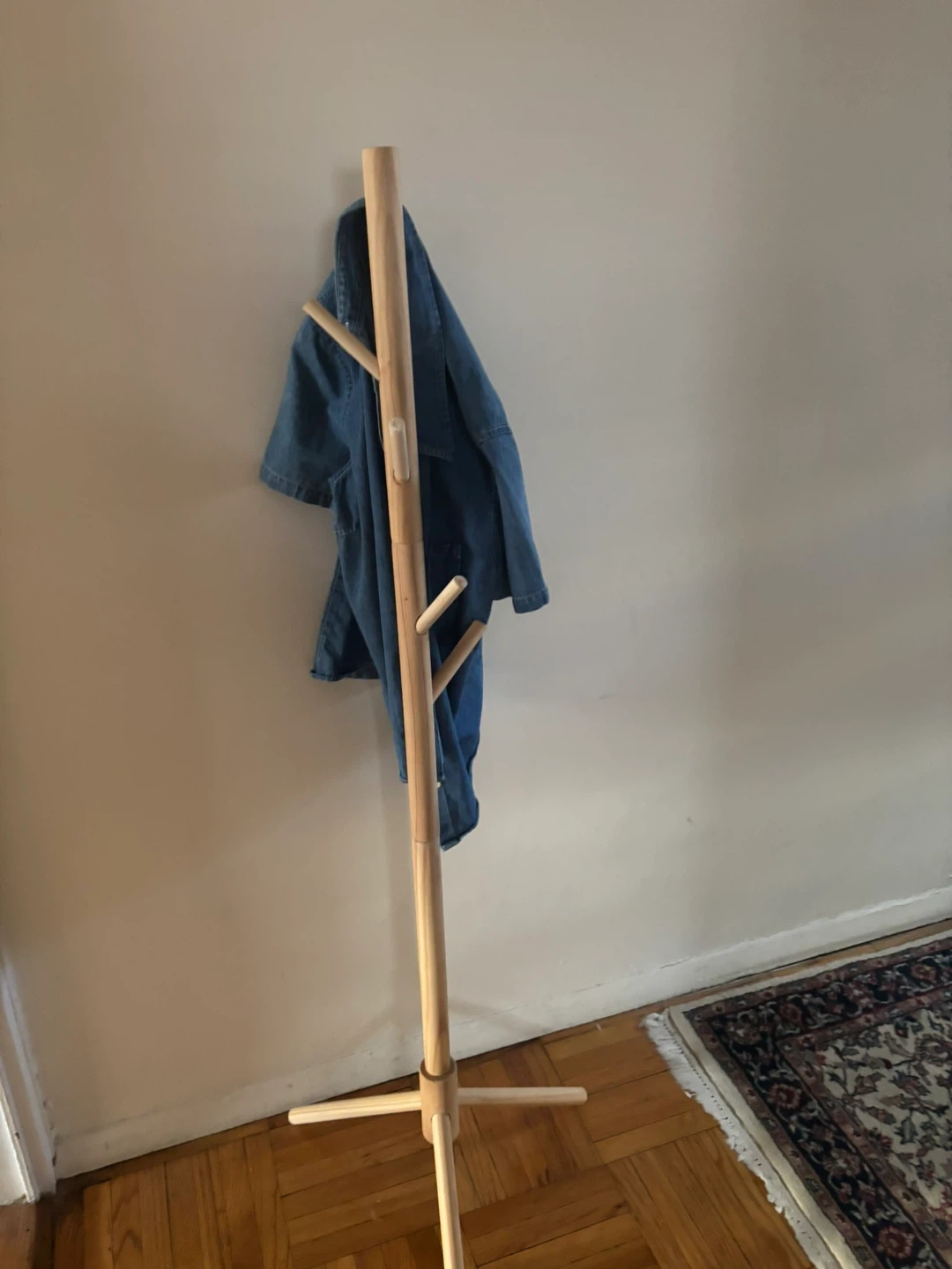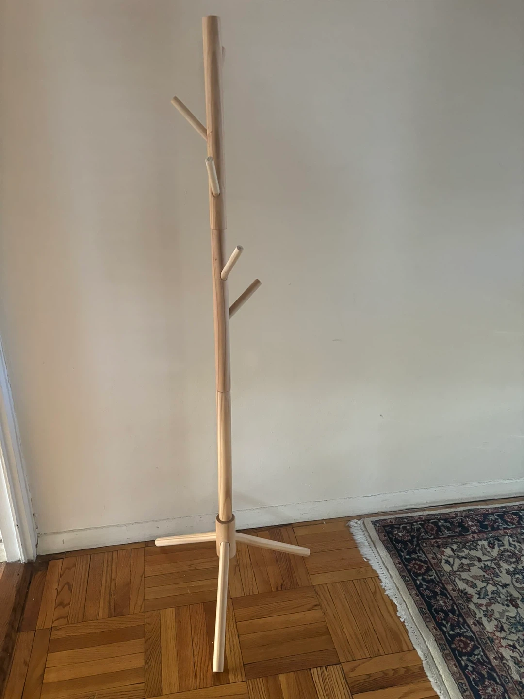 Selling a simple natural wood coat rack! It's perfect for anyone, but ideal for a child to hang their coats and clothes. It's in excellent condition and ready to use!