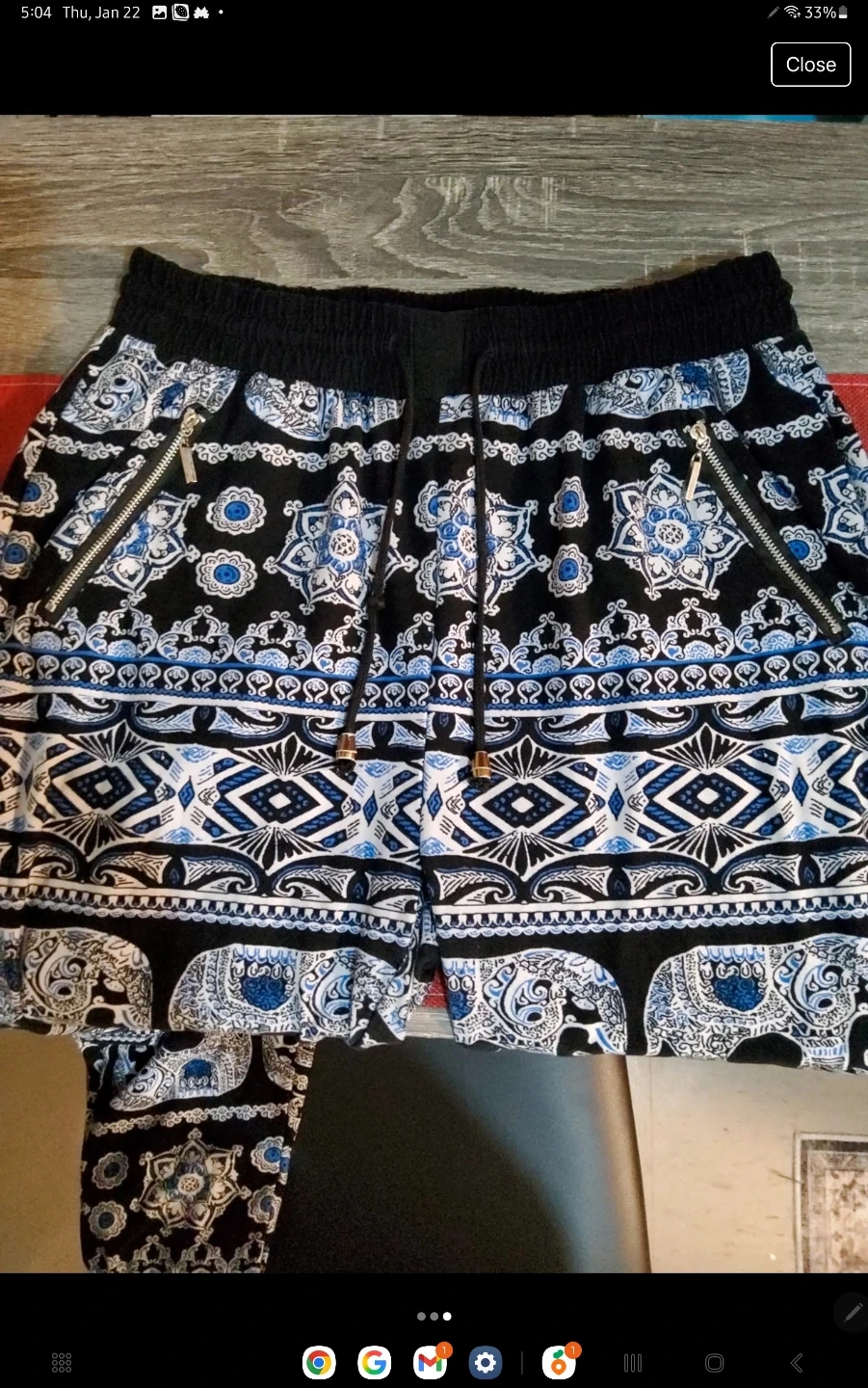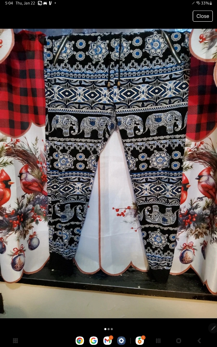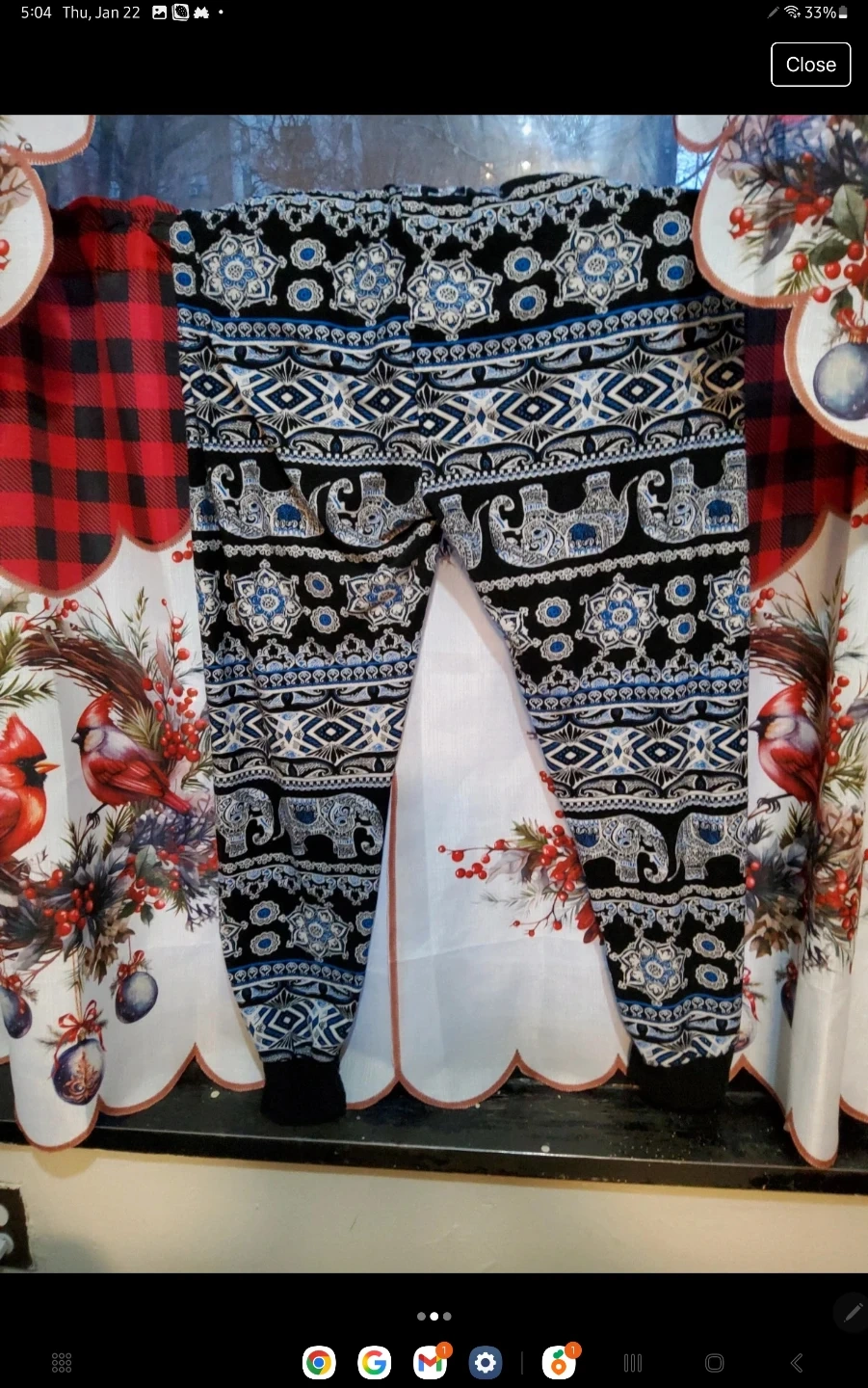 Comfy pajama pants featuring a black background with a vibrant blue and white elephant and floral pattern. These pants have an elastic waistband with a drawstring and zippered pockets. Perfect for lounging!