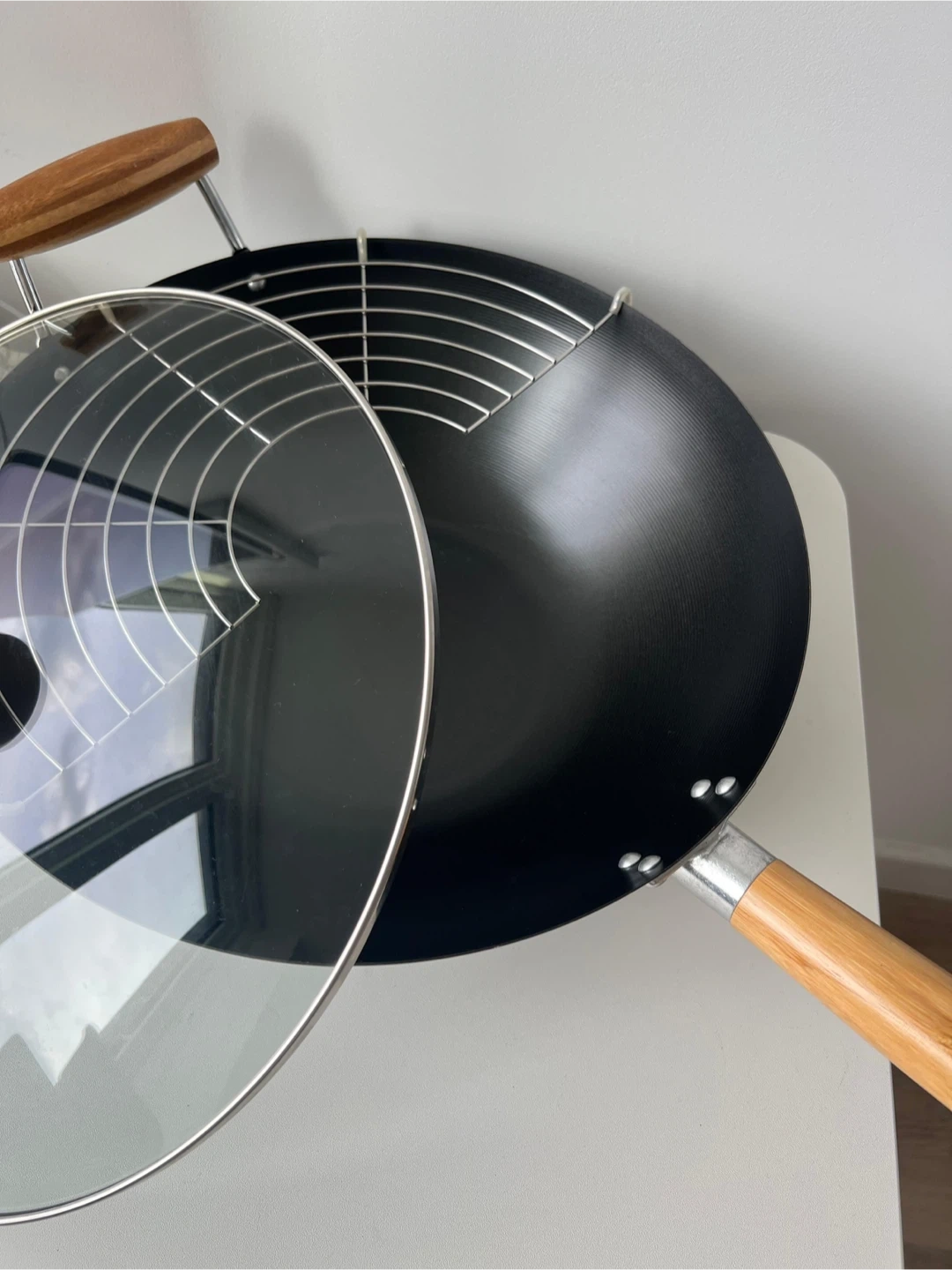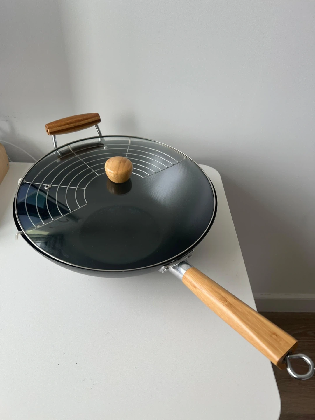 33Selling a wok that comes with a lid and tempura rack. The wok has a wooden handle and a sleek, modern design. It's in great condition.