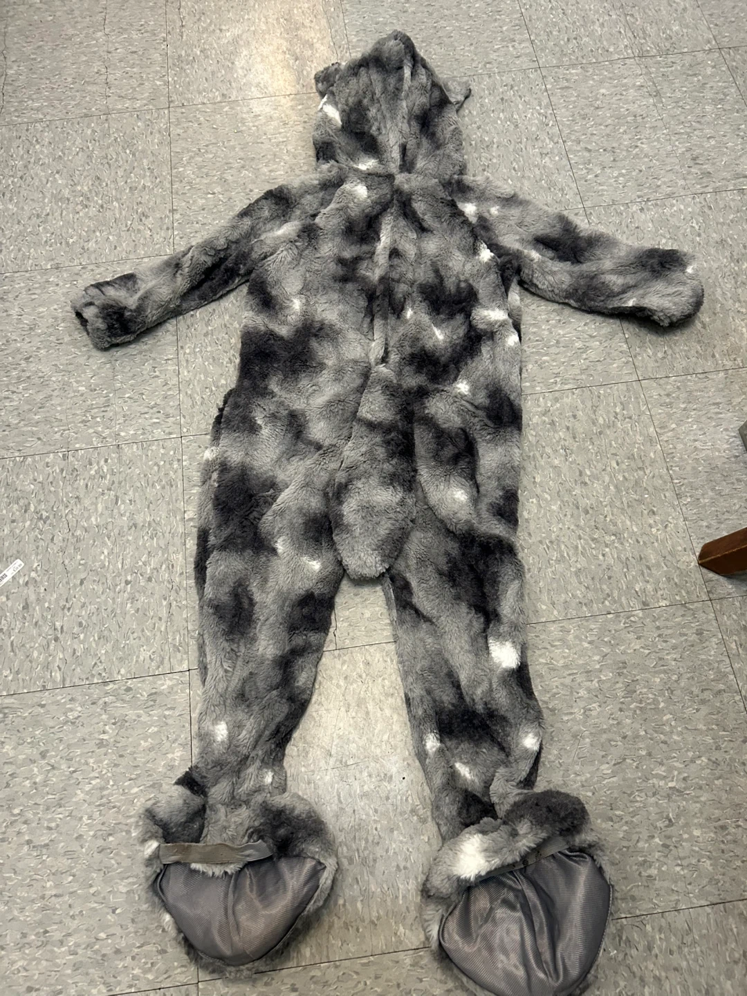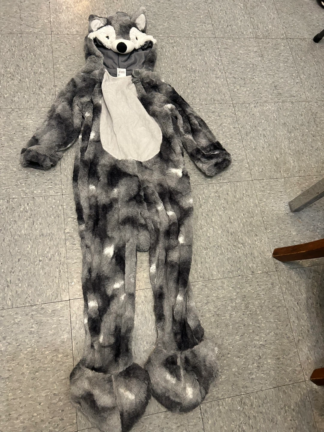 Selling a fun wolf onesie costume! It's a comfy and cozy outfit perfect for lounging or dressing up. The onesie features a hood with wolf ears and a tail. It appears to be in good condition and is a kids size 4T-5T