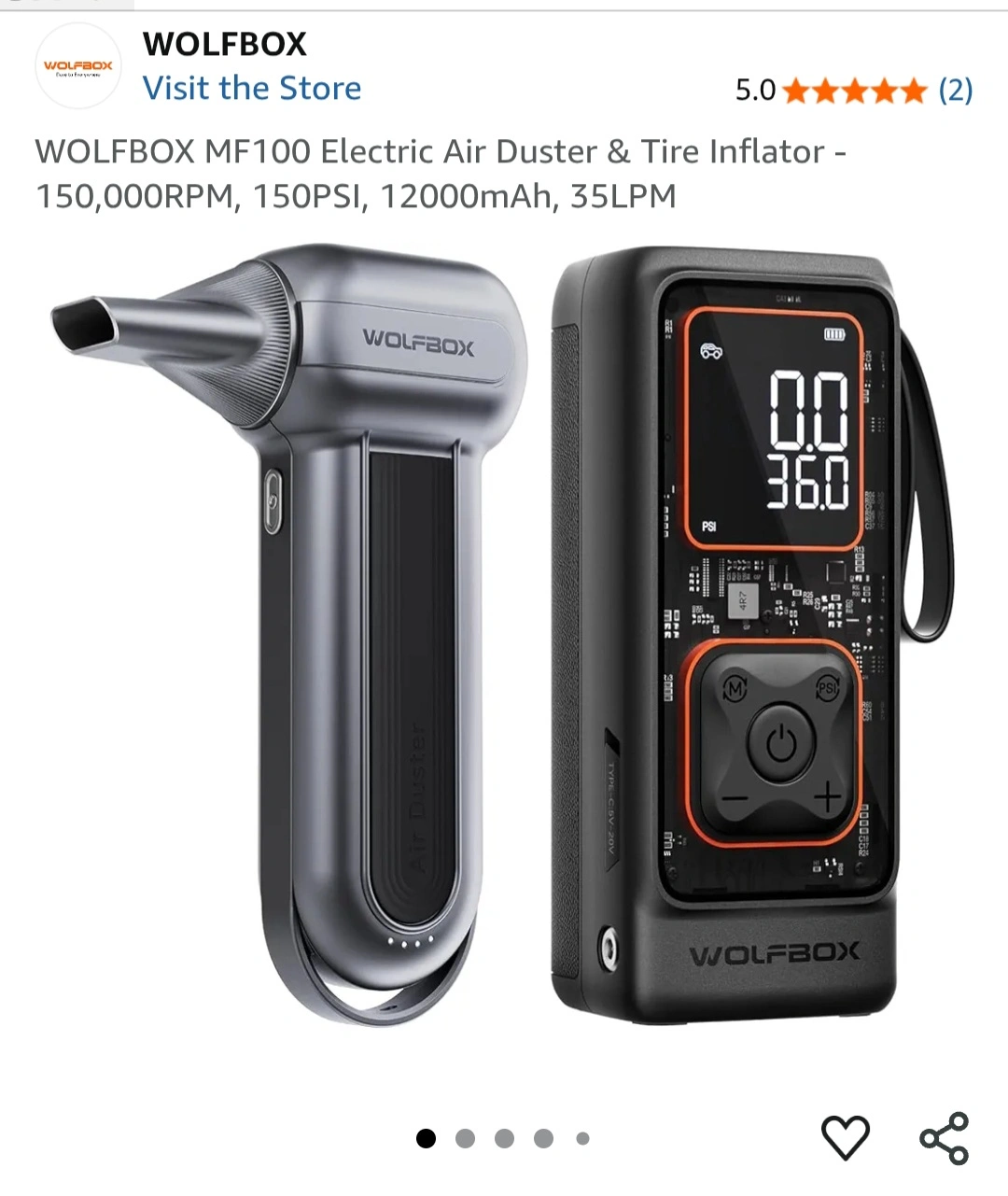 I'm selling a WOLFBOX MF100 Electric Air Duster & Tire Inflator. It features 150,000RPM, 150PSI, 12000mAh, and 35LPM. Great for keeping things clean and inflating tires!
