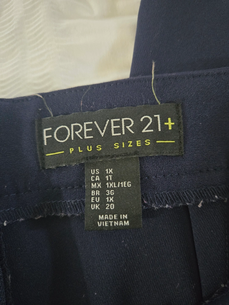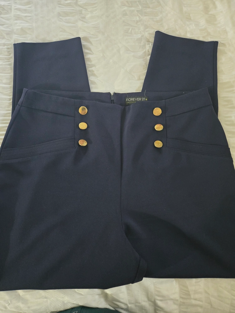 Women's long pants from Forever 21. They were tailored to my height which I'm 5' 1, wore only twice. They are high waisted, zipper in the back, & are blue. I wear a size 14 & these fit good