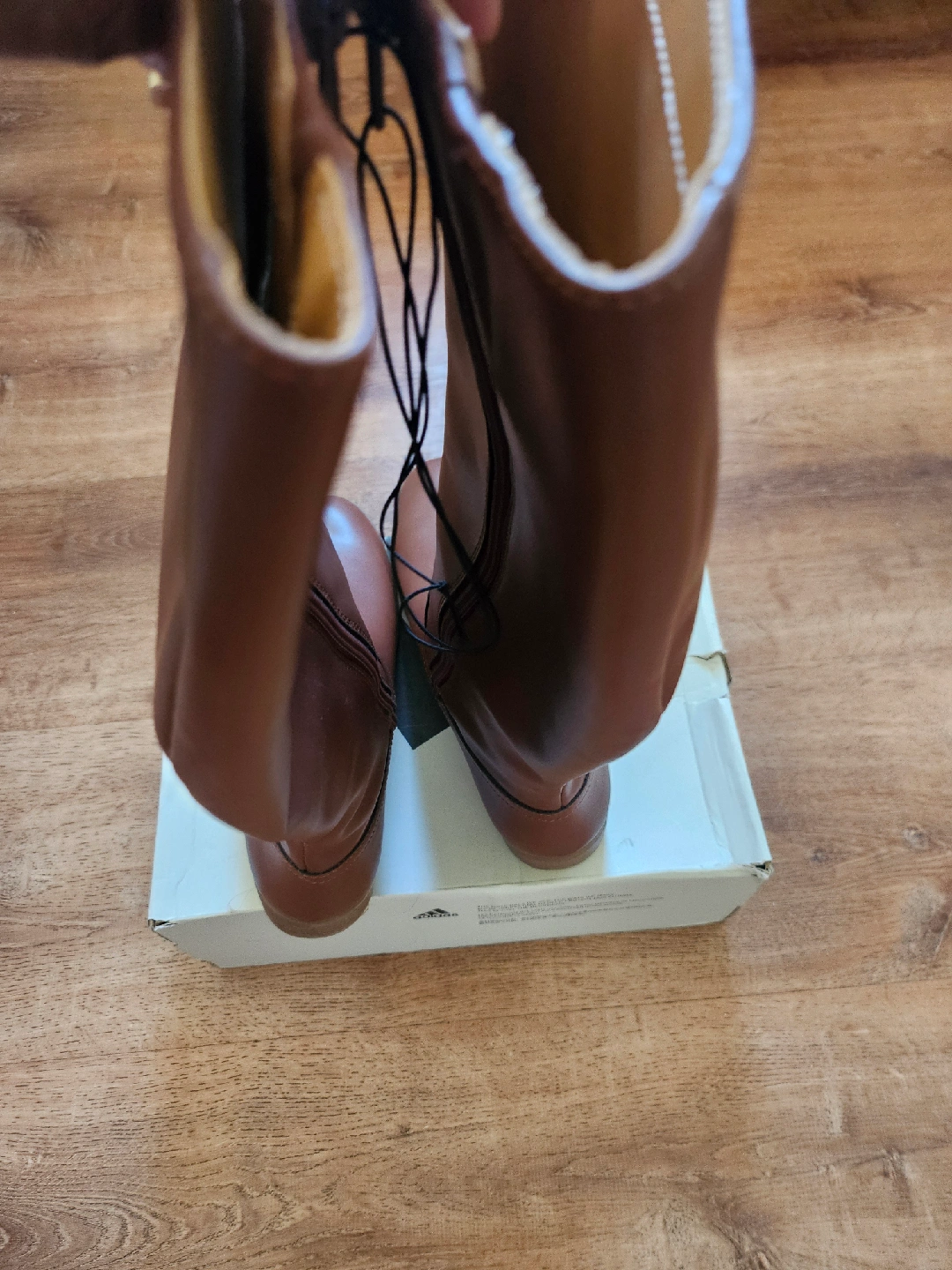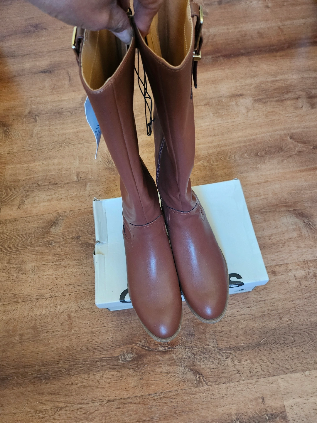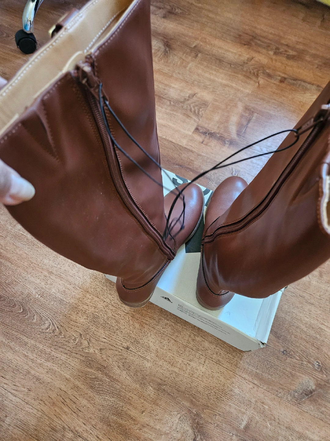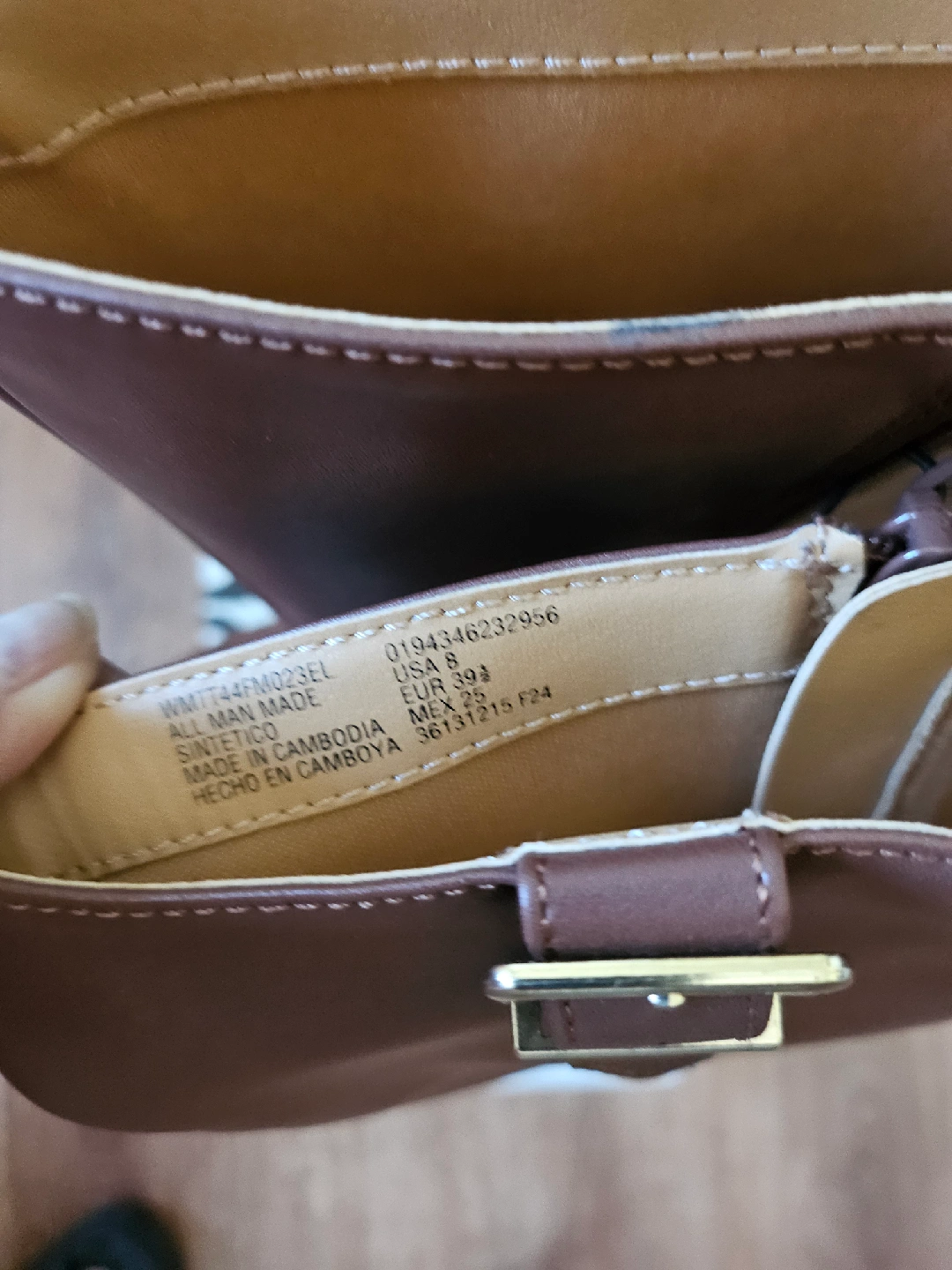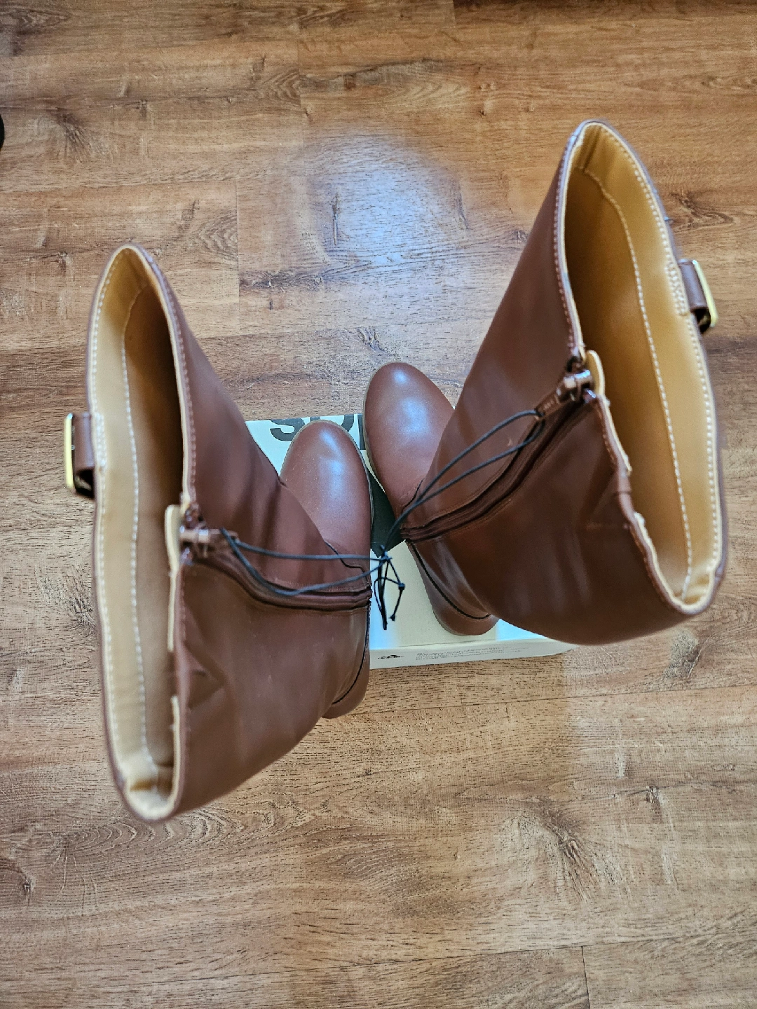 65Selling a pair of brown boots, size 8. They are all man-made with a synthetic material. Made in Cambodia. wide shaft