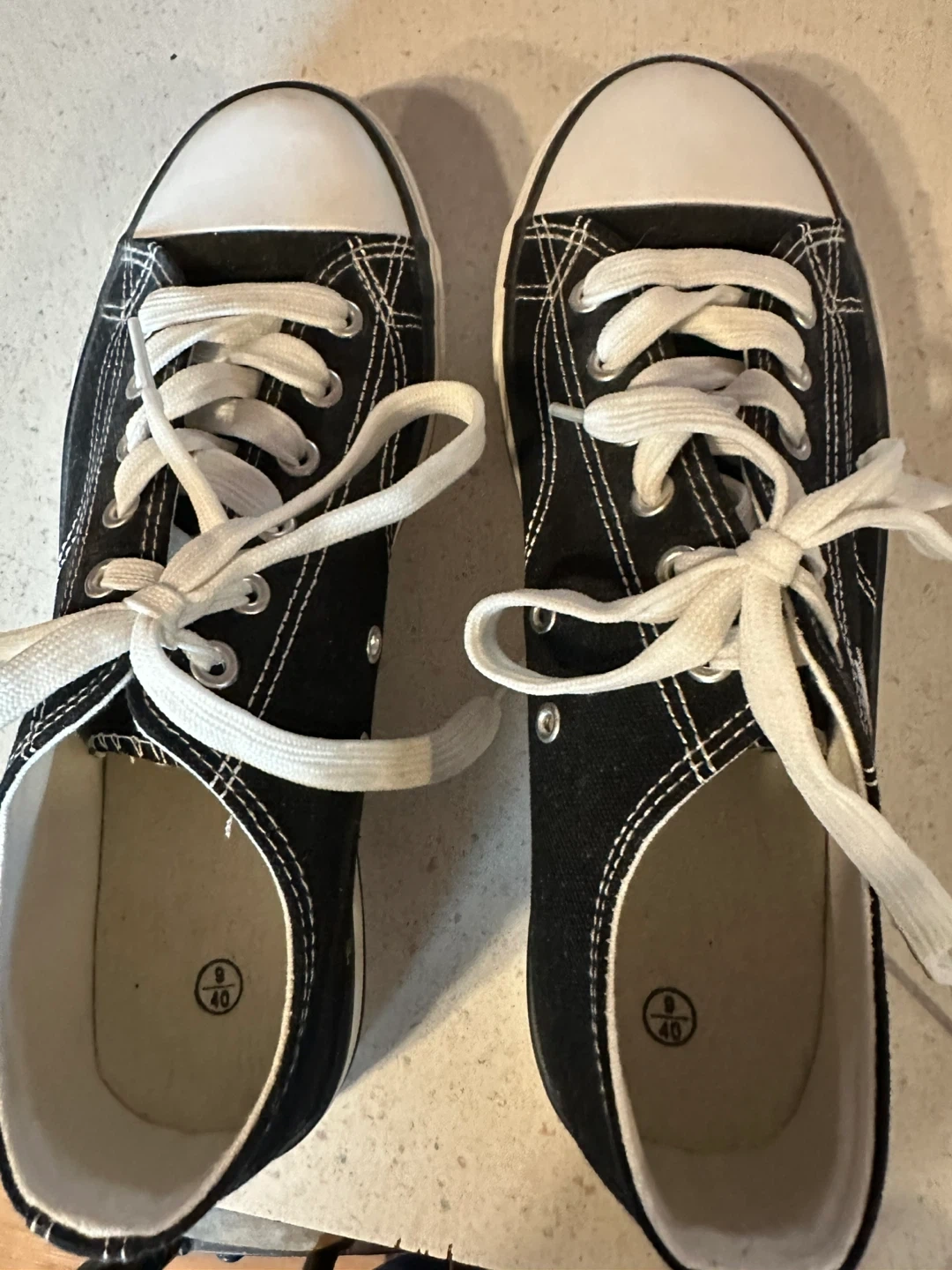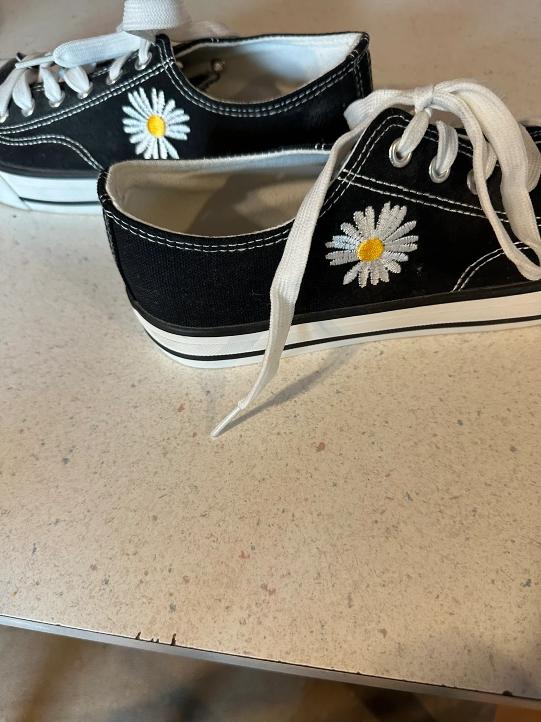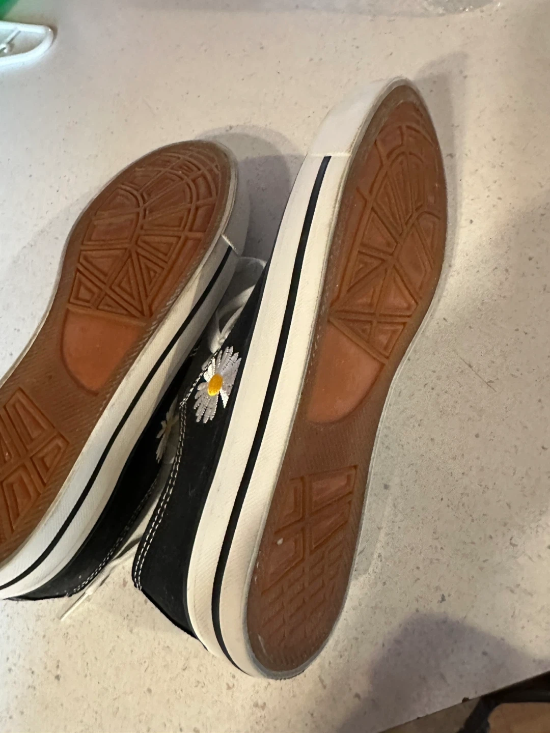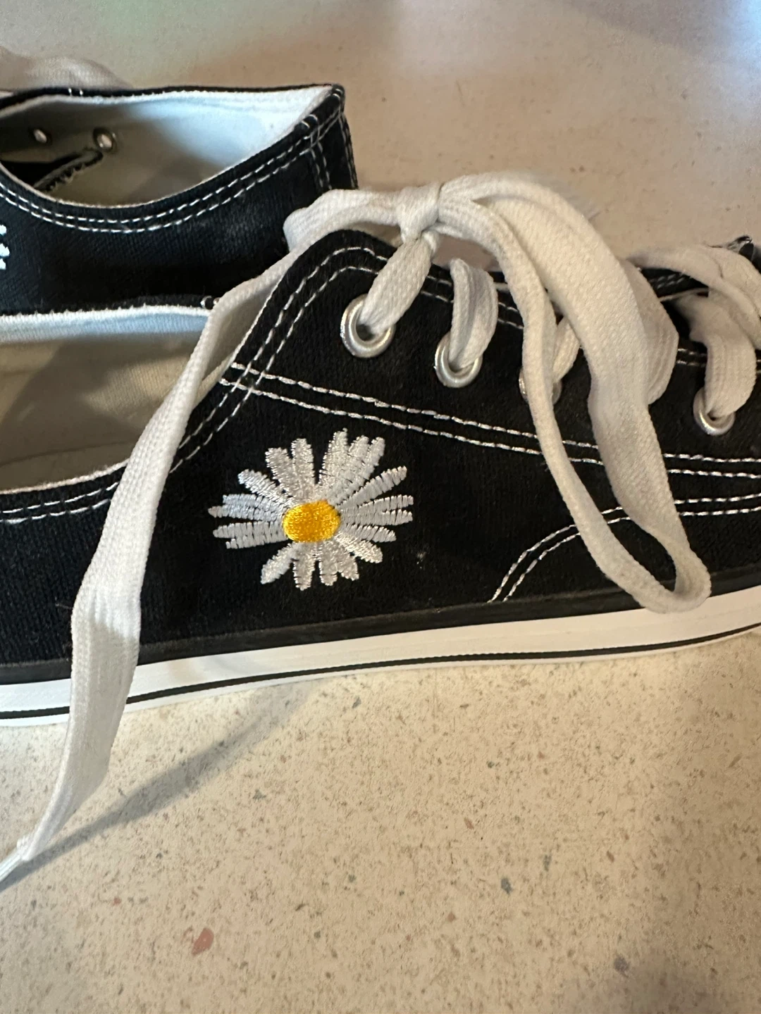 Black and white look like converse but are NOT! Have adorable daisy on each side of sneaker. Woman’s size 9. Barely worn as seen in photo.