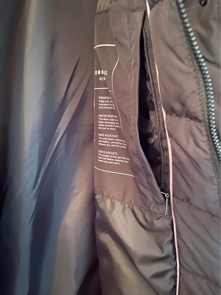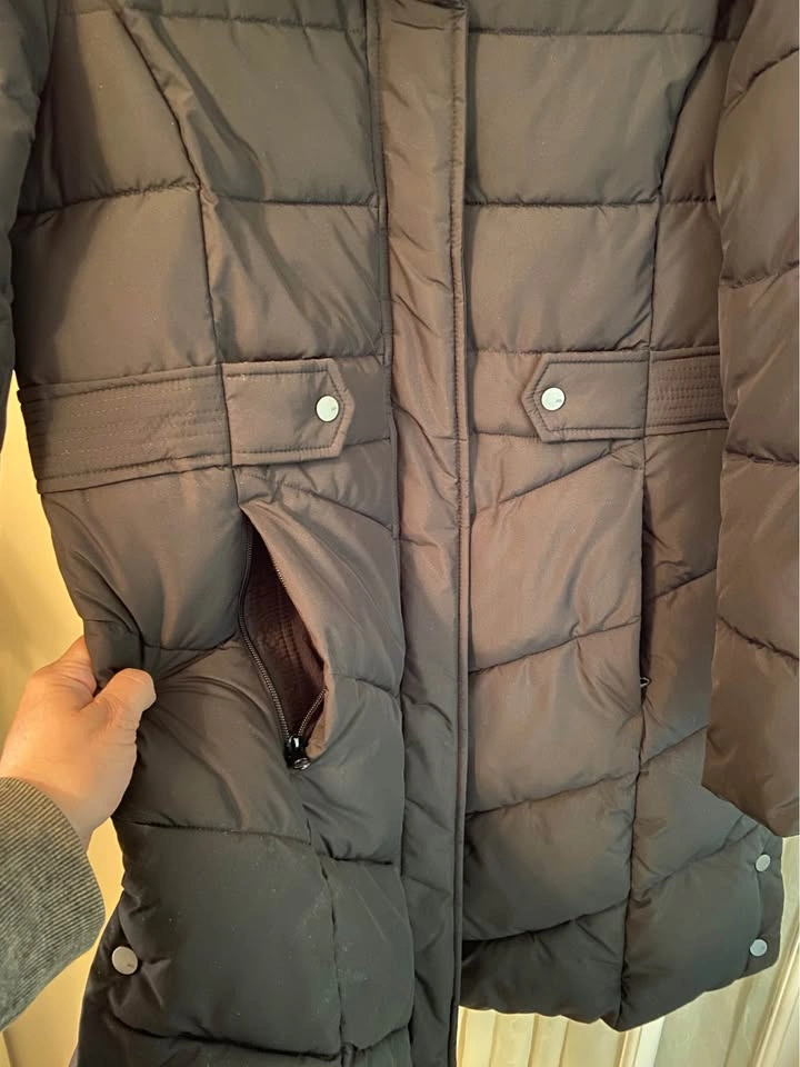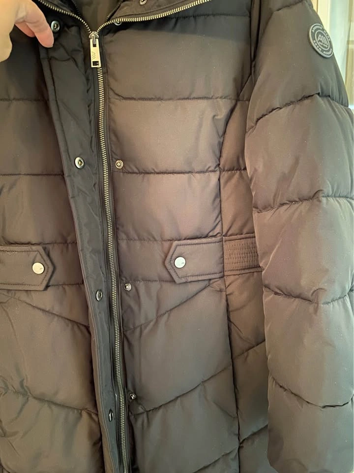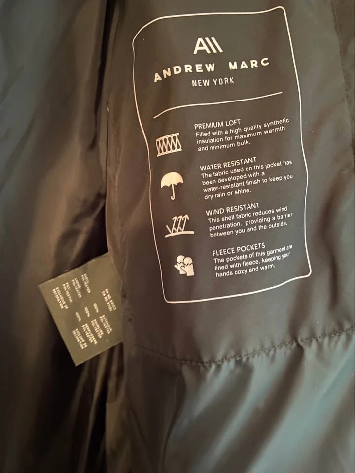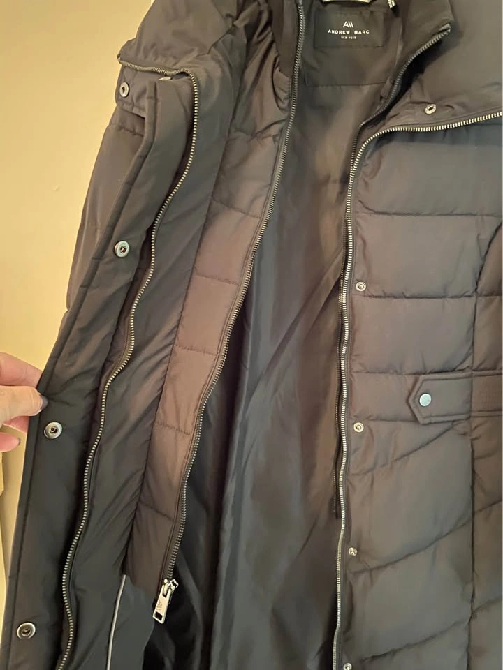 Women’s Andrew Marc Adler Bib Puffer Coat, in Black, size Large. Excellent, Barely-Used Condition. Original $300 from Von Maur. Made of a quilted soft matte shell. Coat is fully lined. The shell, fill, lining and trim are all 100% polyester, machine washable. Front snap and zipper closure, plus inner zip-front bib with rib-knit trim. Two front zip fleece-lined pockets, stand-up collar, and side vents with functional snaps. All zippers and snaps work perfectly. Has a large inner-zip pocket at left chest, is wind resistant, water resistant, and filled with high quality synthetic insulation for maximum warmth and minimum bulk. This is a heavyweight coat for warmth, with a lightweight feel. Designed to be slightly fitted. Designed to hit above the knees. Length from shoulder to hem is approximately 37 inches. There is a small white mark to the back lower left of coat, it is barely noticeable, just wanted to mention…shown in last picture. Otherwise, the coat is in excellent condition! No stains, rips, snags, scratches, holes, or tears. Cash only. *Meet in Garfield Ridge, Chicago, near Midway. *Willing to meet near Oak Lawn, EP, Alsip, Orland, Palos, Burbank, Bridgeview, Countryside, LaGrange, Burr Ridge, Darien ☺️
