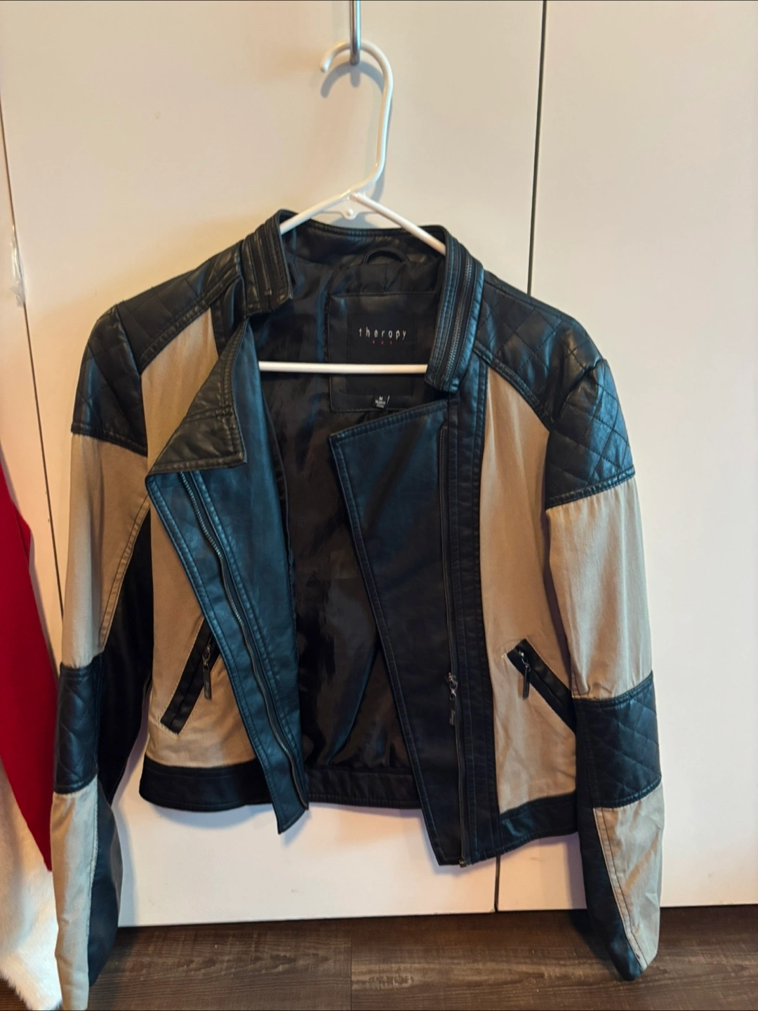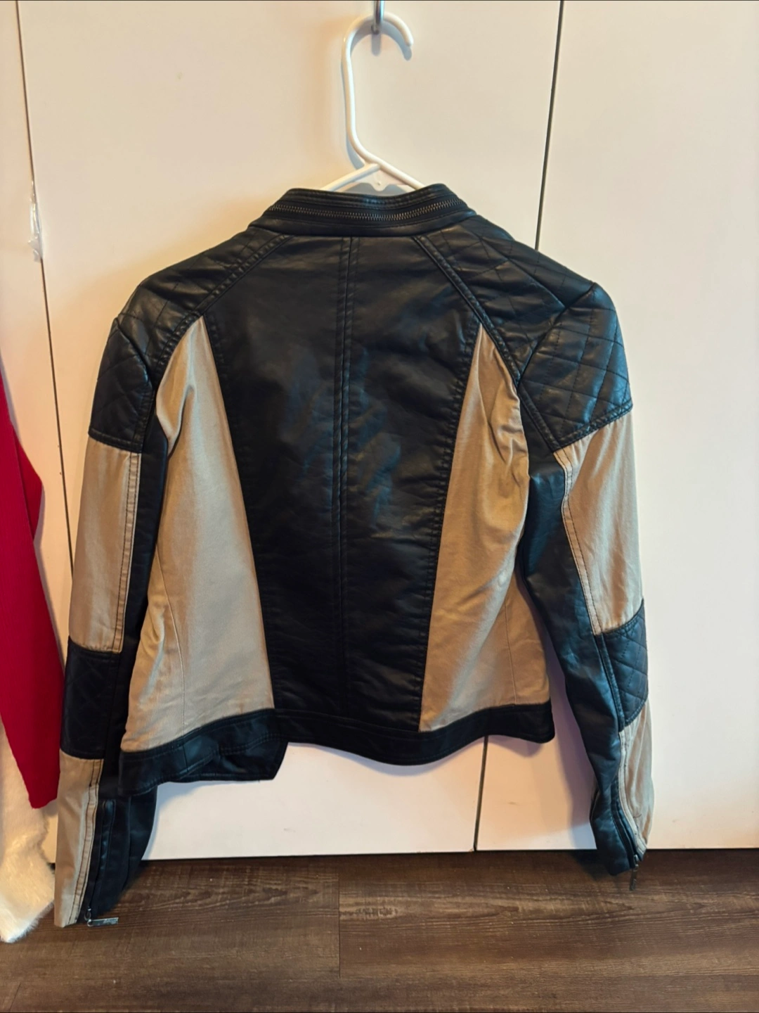 Color block cropped moto jacket. Black and beige. Zipper closure. Long sleeves. Two zipper pockets.