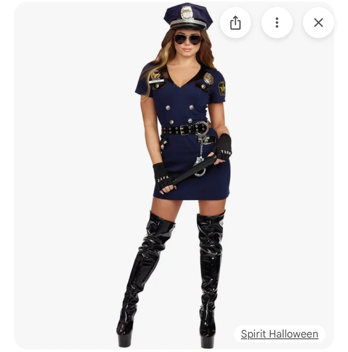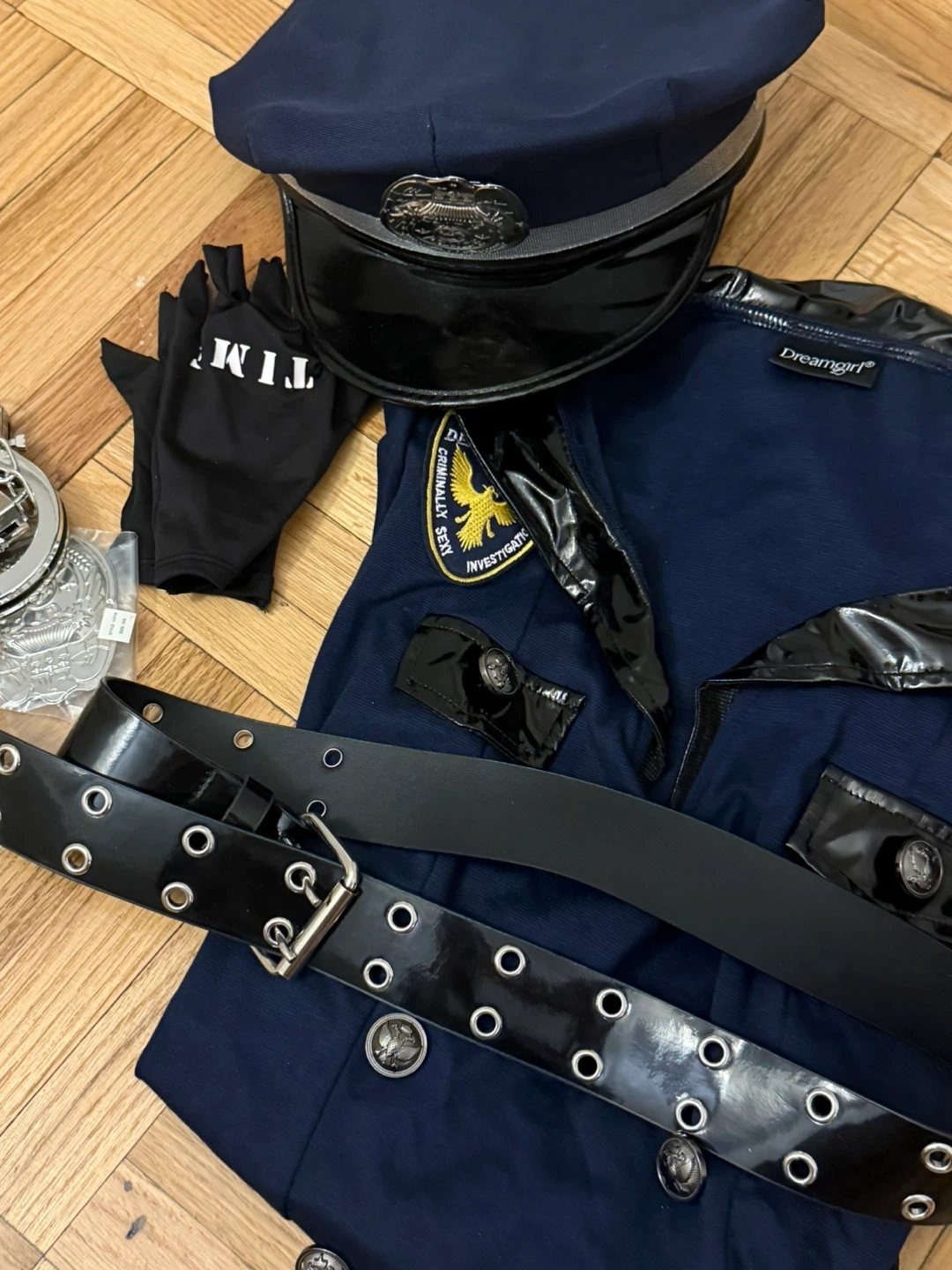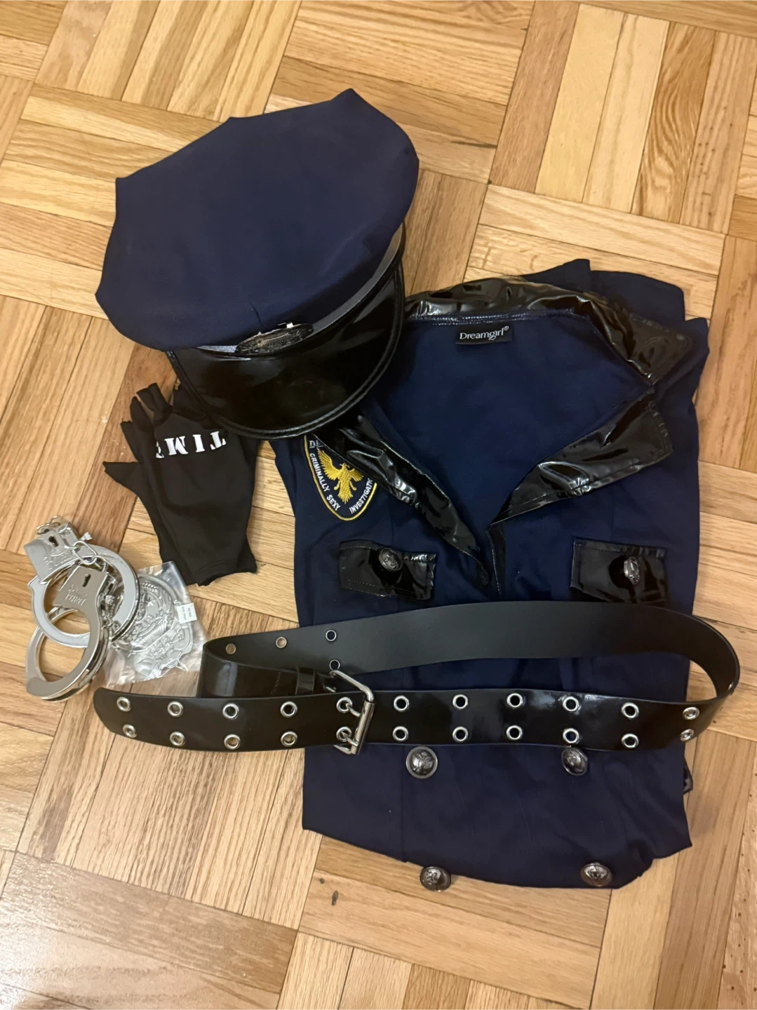 It includes the costume, hat, belt, badge, name tag, gloves and handcuffs. Perfect for Halloween or a costume party!
