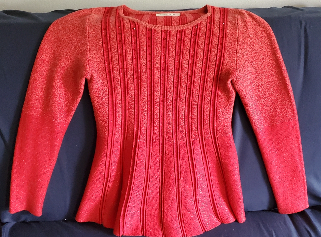 This is a Skye's The Limit women's long sleeve top in red. It has a unique design with vertical lines and small embellishments. It's in great condition and ready for a new home!