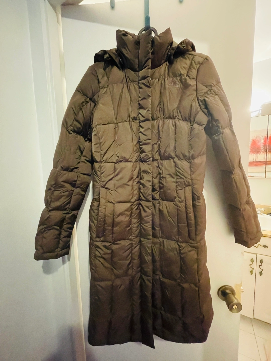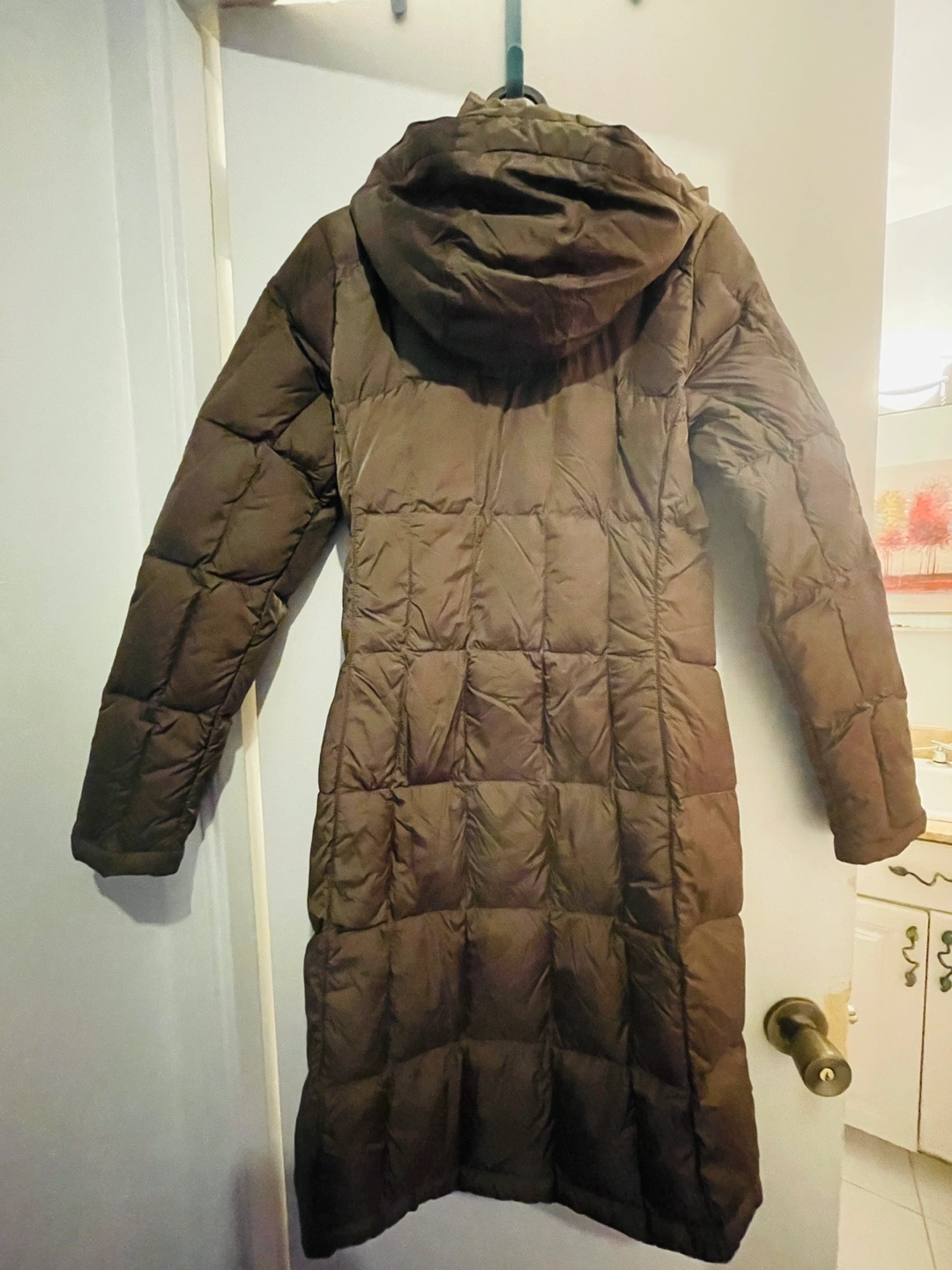 47Long brown puffer coat. Hooded. Zipper and snap closure. Great condition.