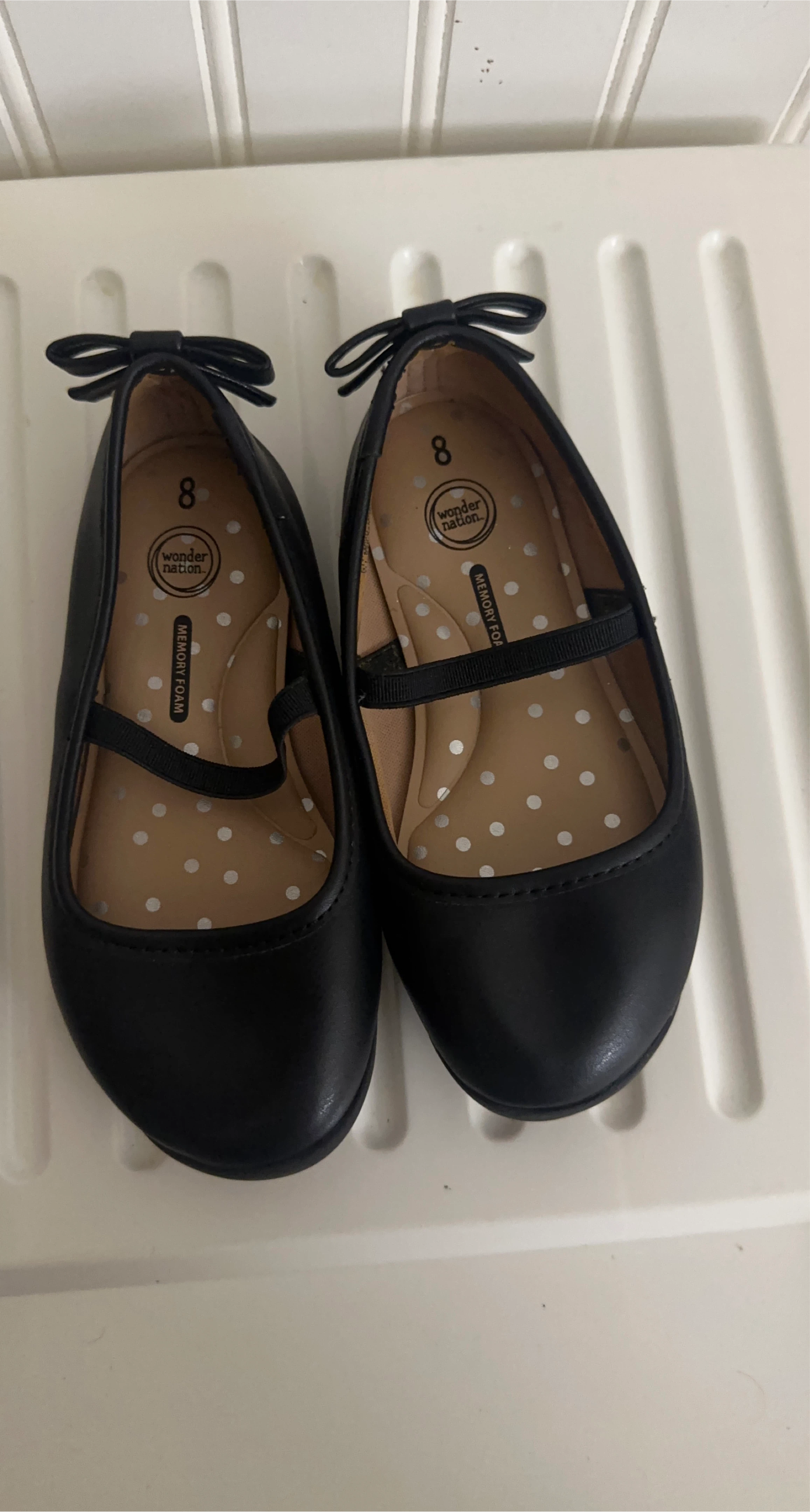 73Cute pair of black ballet flats from Wonder Nation! These are a size 8 and feature a sweet little bow on top. They have a memory foam insole for extra comfort