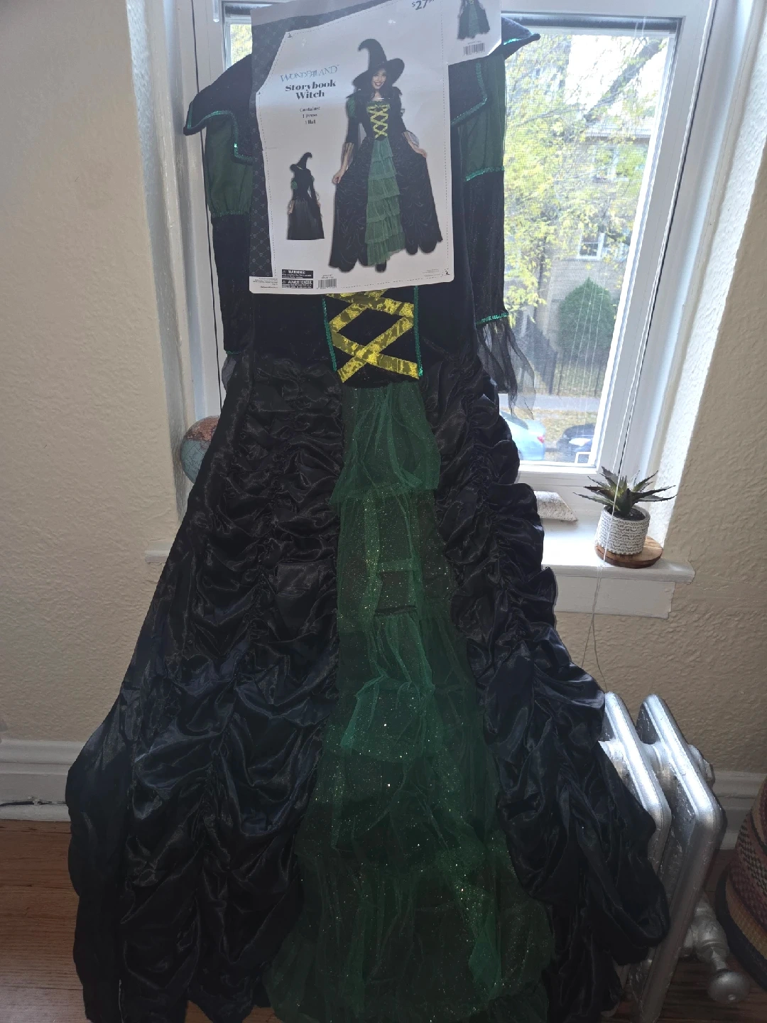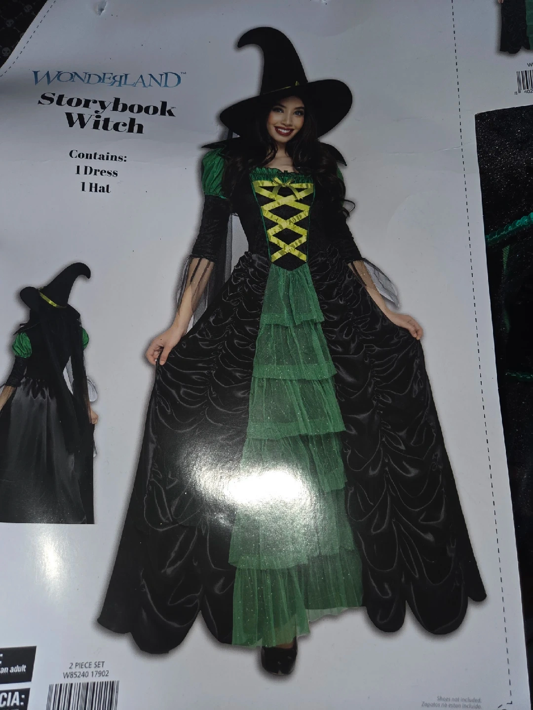 32Get ready for Halloween with this Wonderland Storybook Witch costume! It includes a dress and a hat, perfect for an adult. The costume features a black dress with green accents and a matching witch hat. It's a 2-piece set W85240 17902.