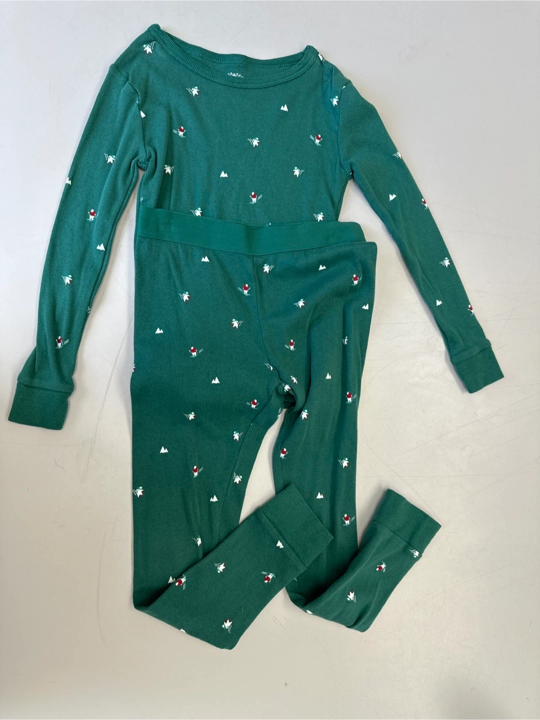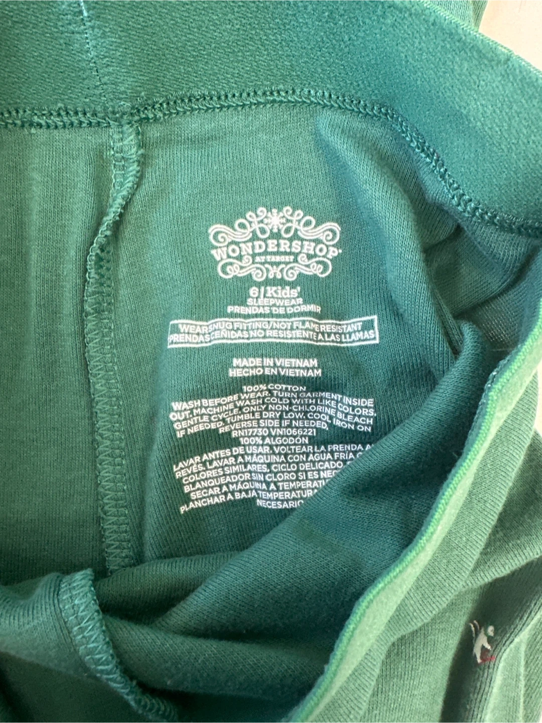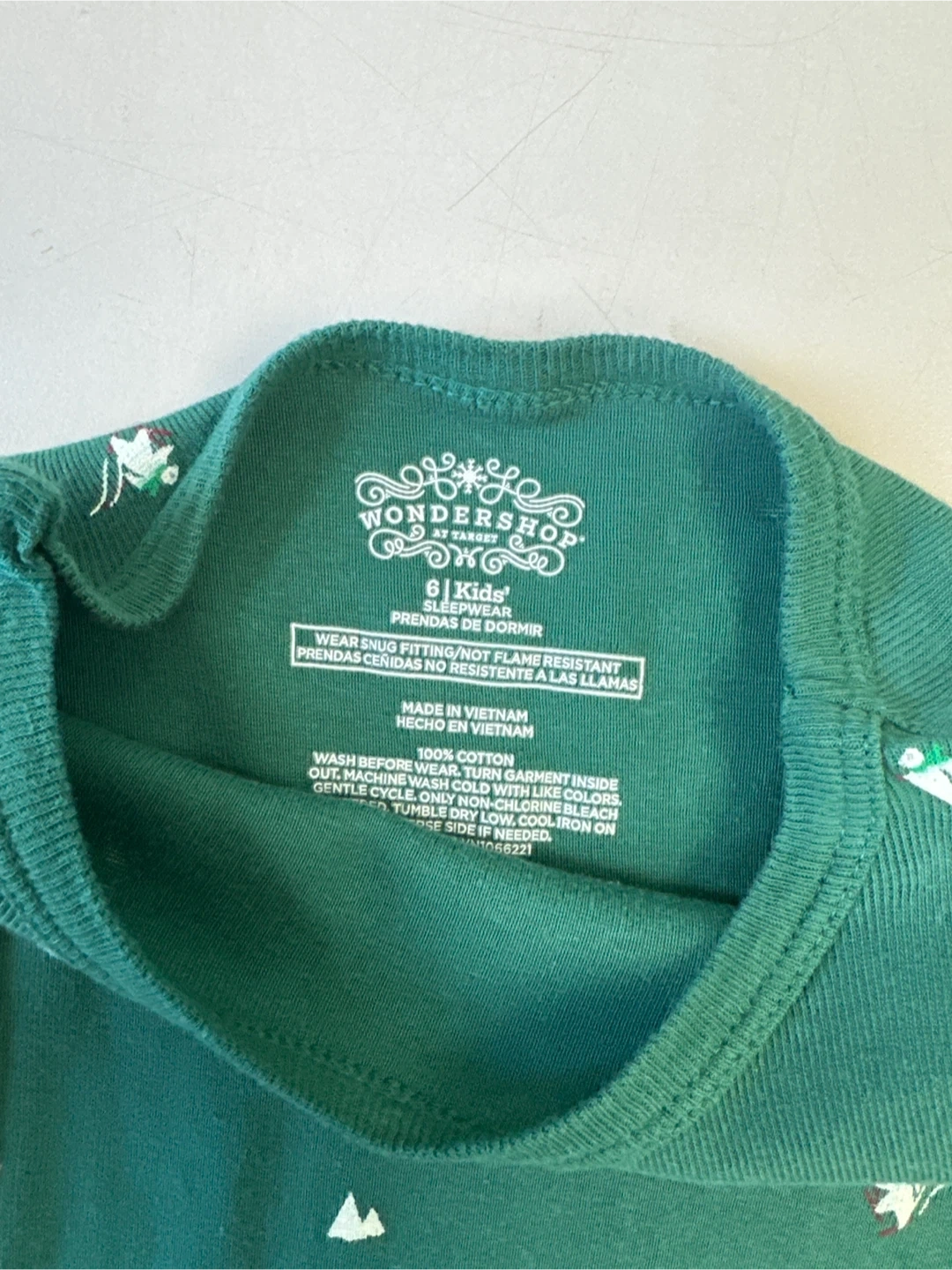 This Wondershop pajama set is perfect for your little one! The set is a size 6 Kids' and features a festive pattern on a comfortable green cotton material. It is made of 100% cotton.