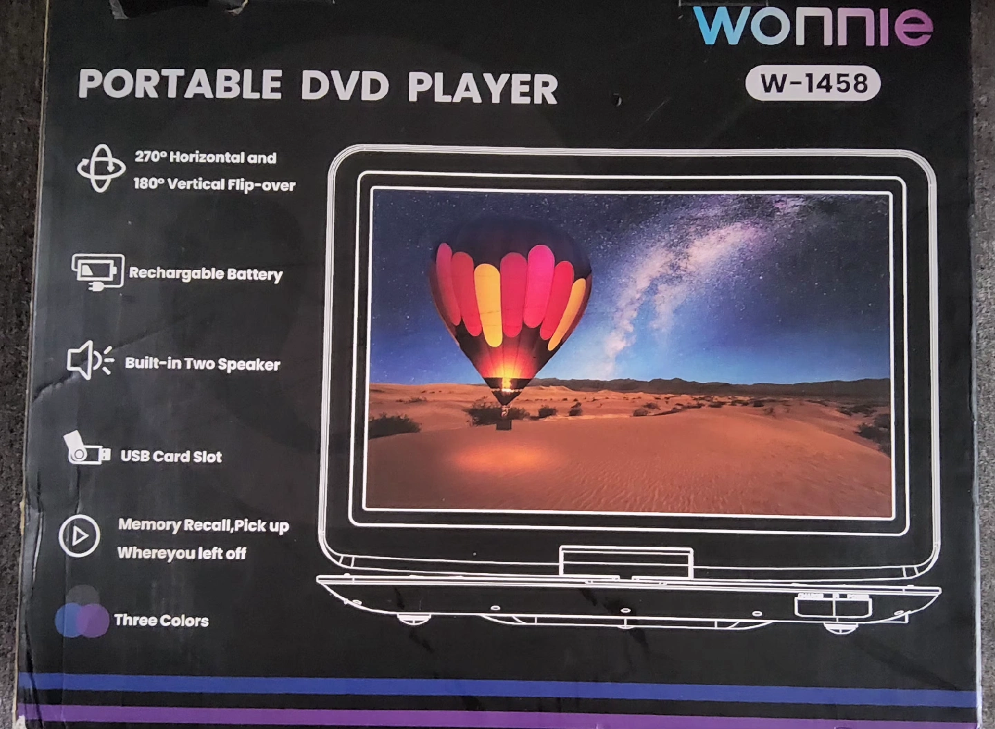 Selling a WONNIE W-1458 portable DVD player! It features: - 270° horizontal and 180° vertical flip-over - Rechargeable battery - Built-in two speakers - USB card slot - Memory recall to pick up where you left off - Three colors