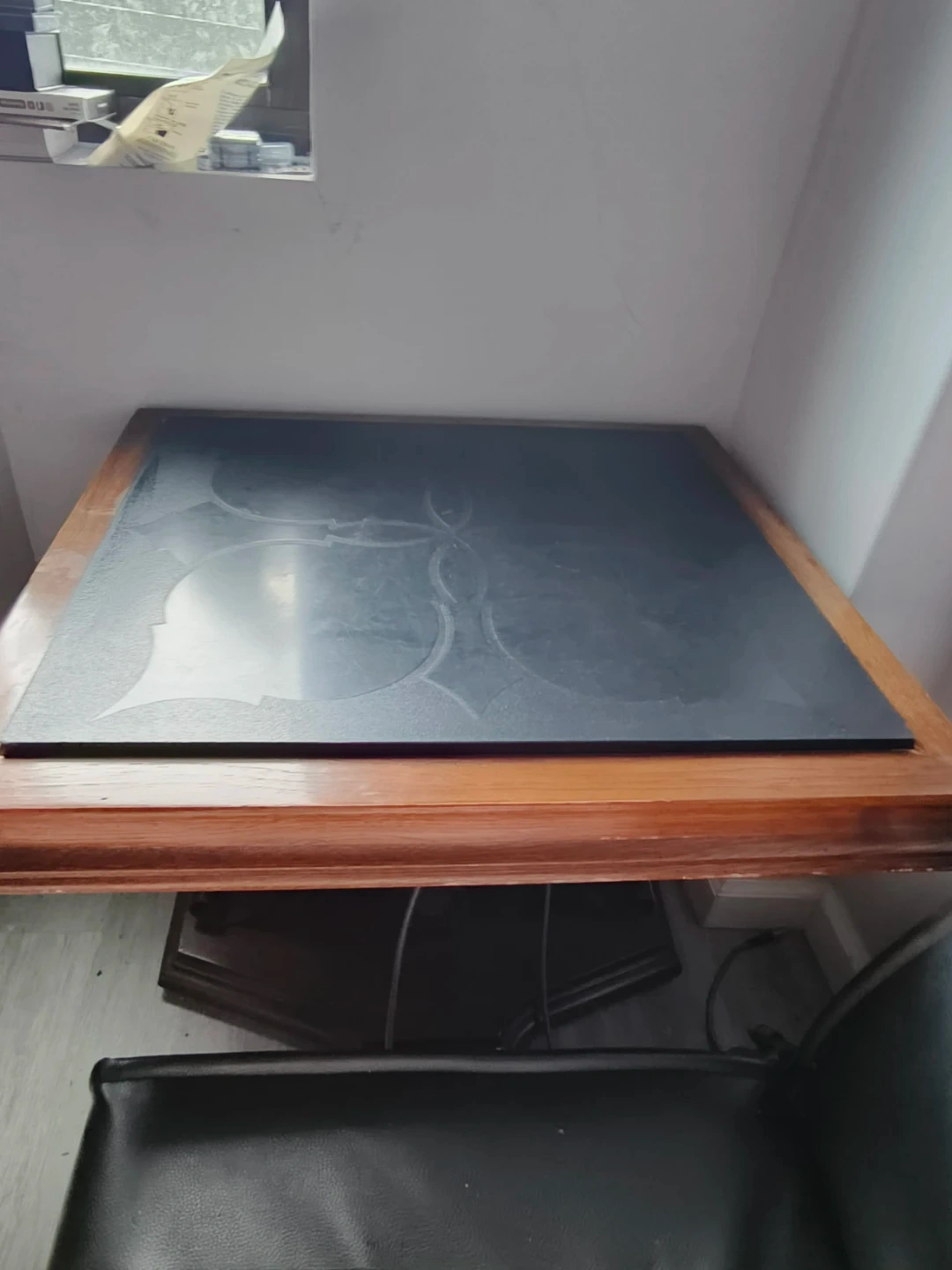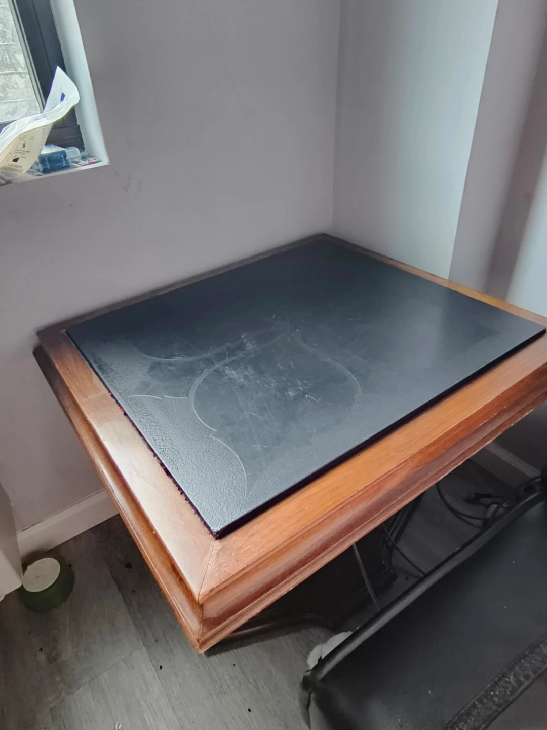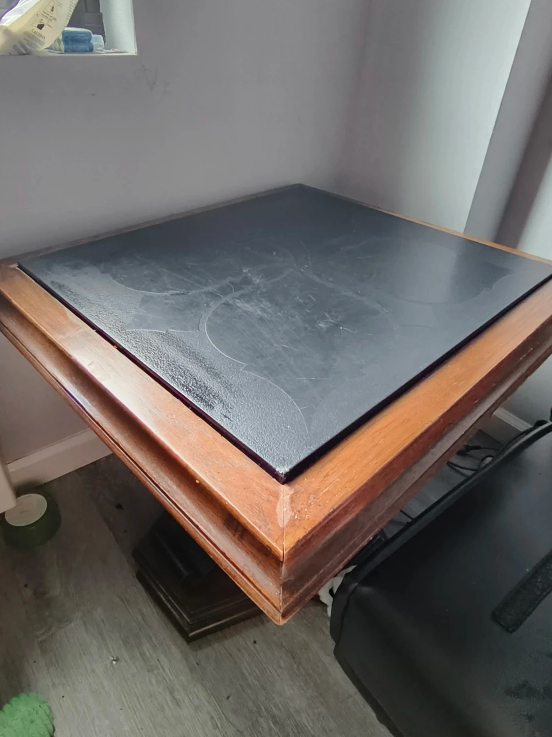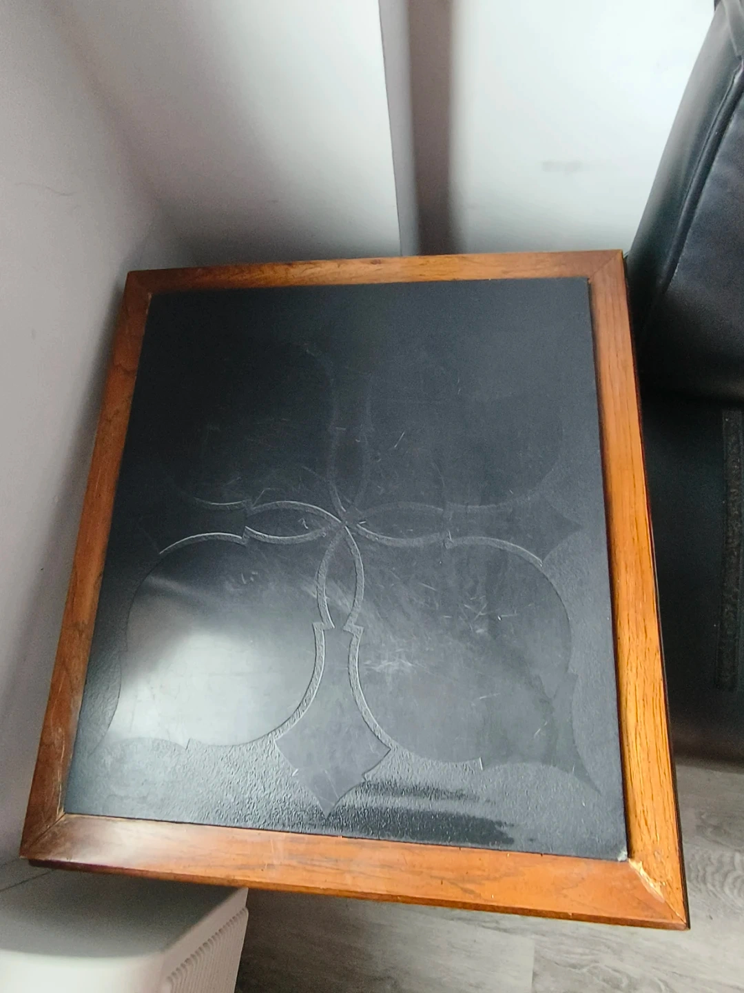 18Selling a side table with a wooden frame and a black top. It has a unique design on the surface. There are some signs of use, but it's still a functional piece of furniture. It's a little off kilter and easily fixable. Pick up only, my building has an elevator. If you saw this post before I lost access to my other account so I'm reposting.