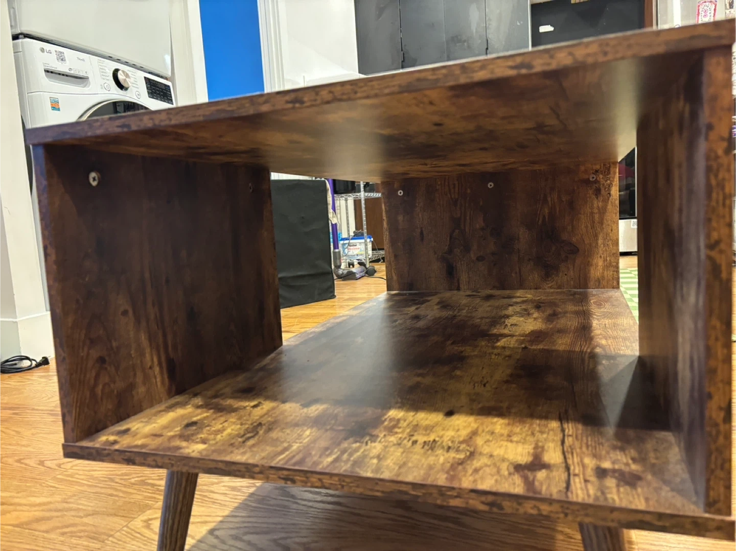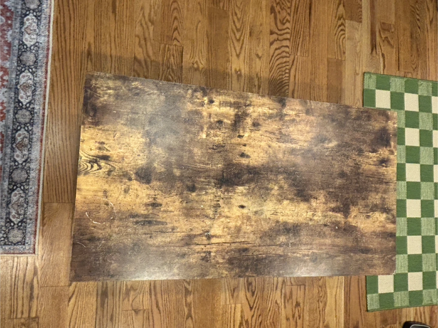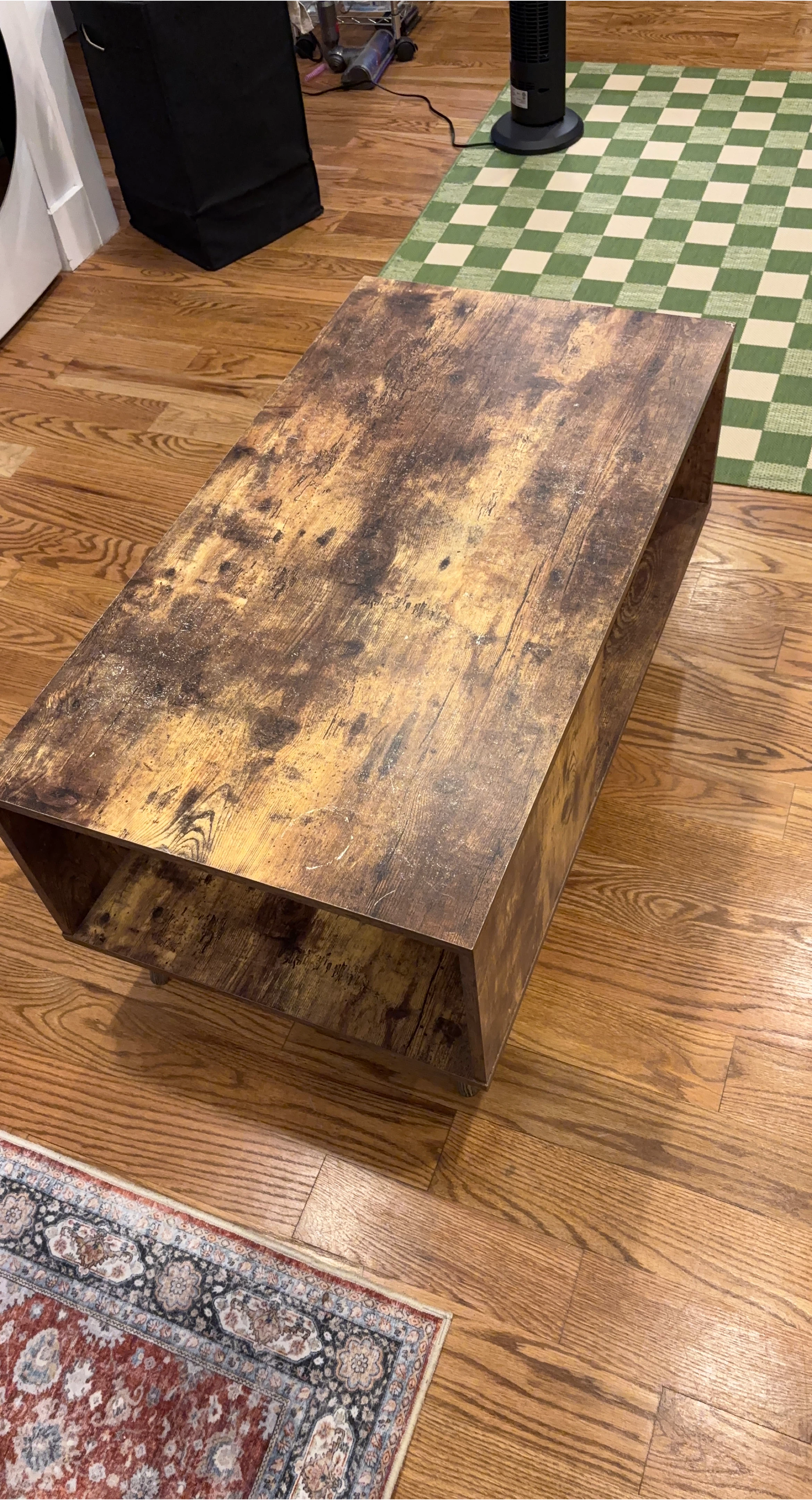 Sturdy wood coffee table with lower shelf for storage. Rustic look, good condition with minor cup mark and small corner chip. Still strong and stylish. Open to offers