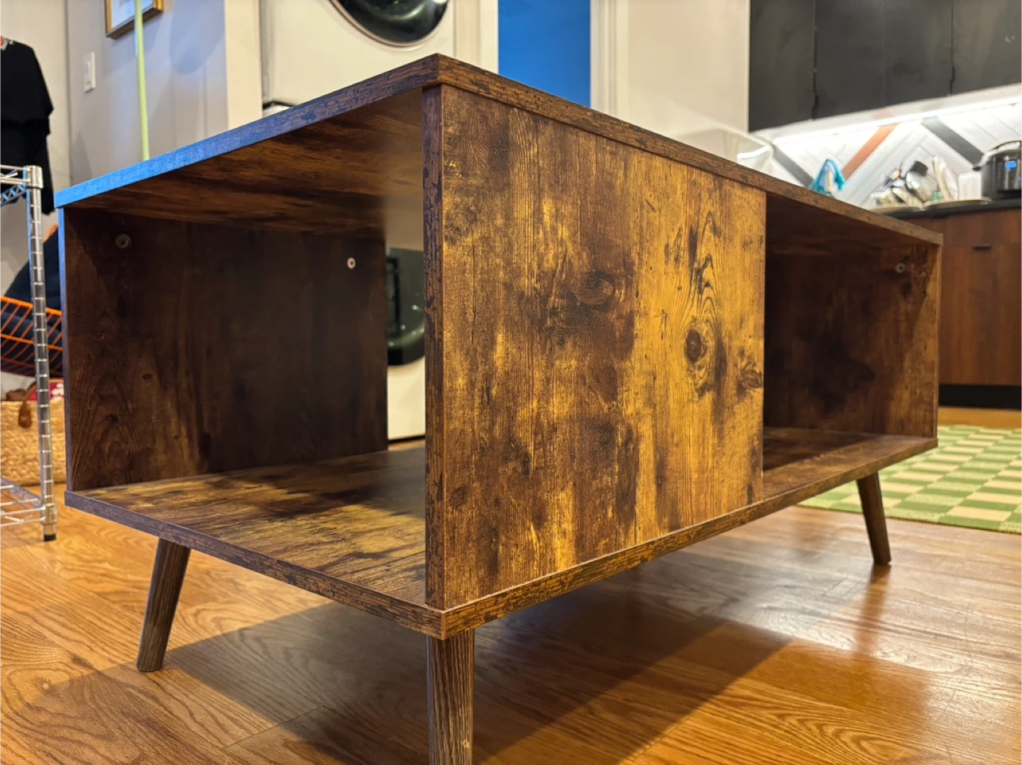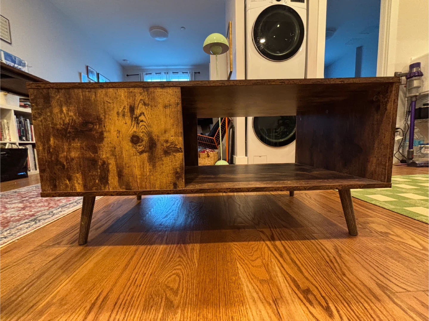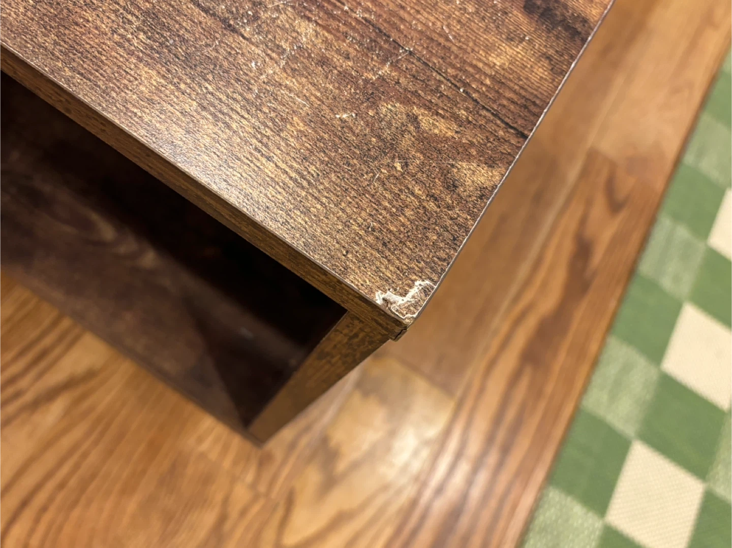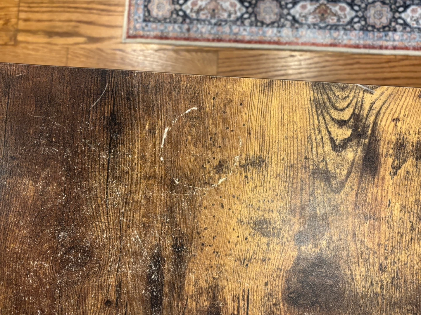 Sturdy wood coffee table with lower shelf for storage. Rustic look, good condition with minor cup mark and small corner chip. Still strong and stylish. Open to offers