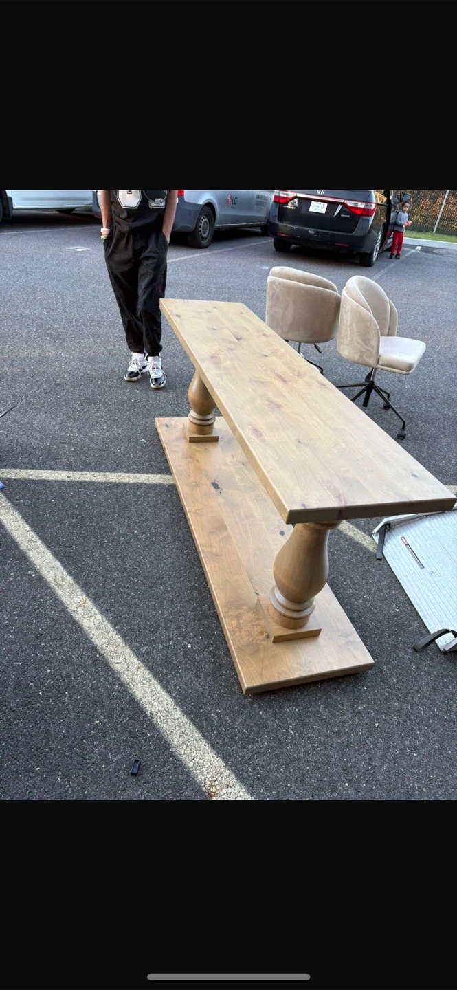 Selling a wood console table. It's a great piece for adding a touch of rustic charm to your entryway or living room. The table is sturdy and in good condition.