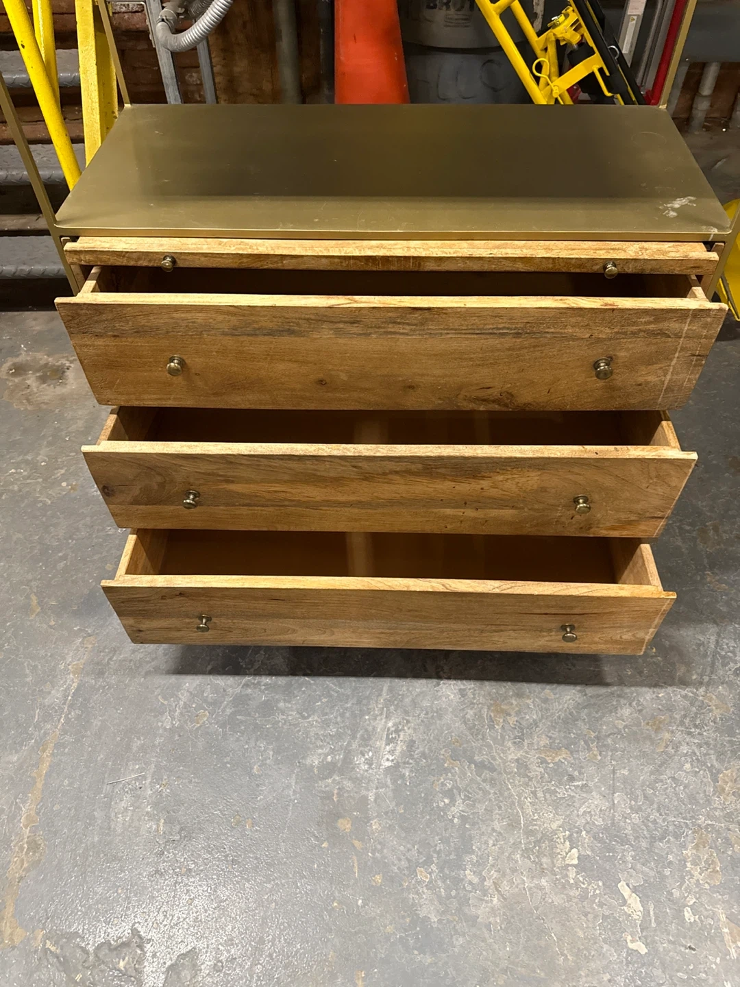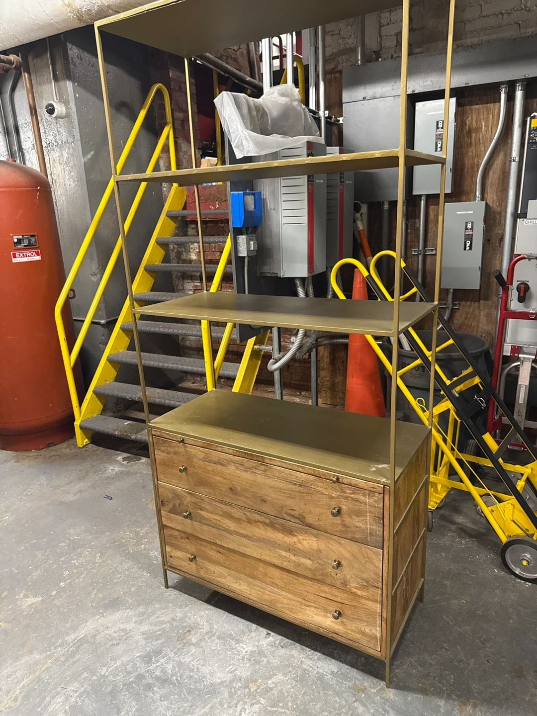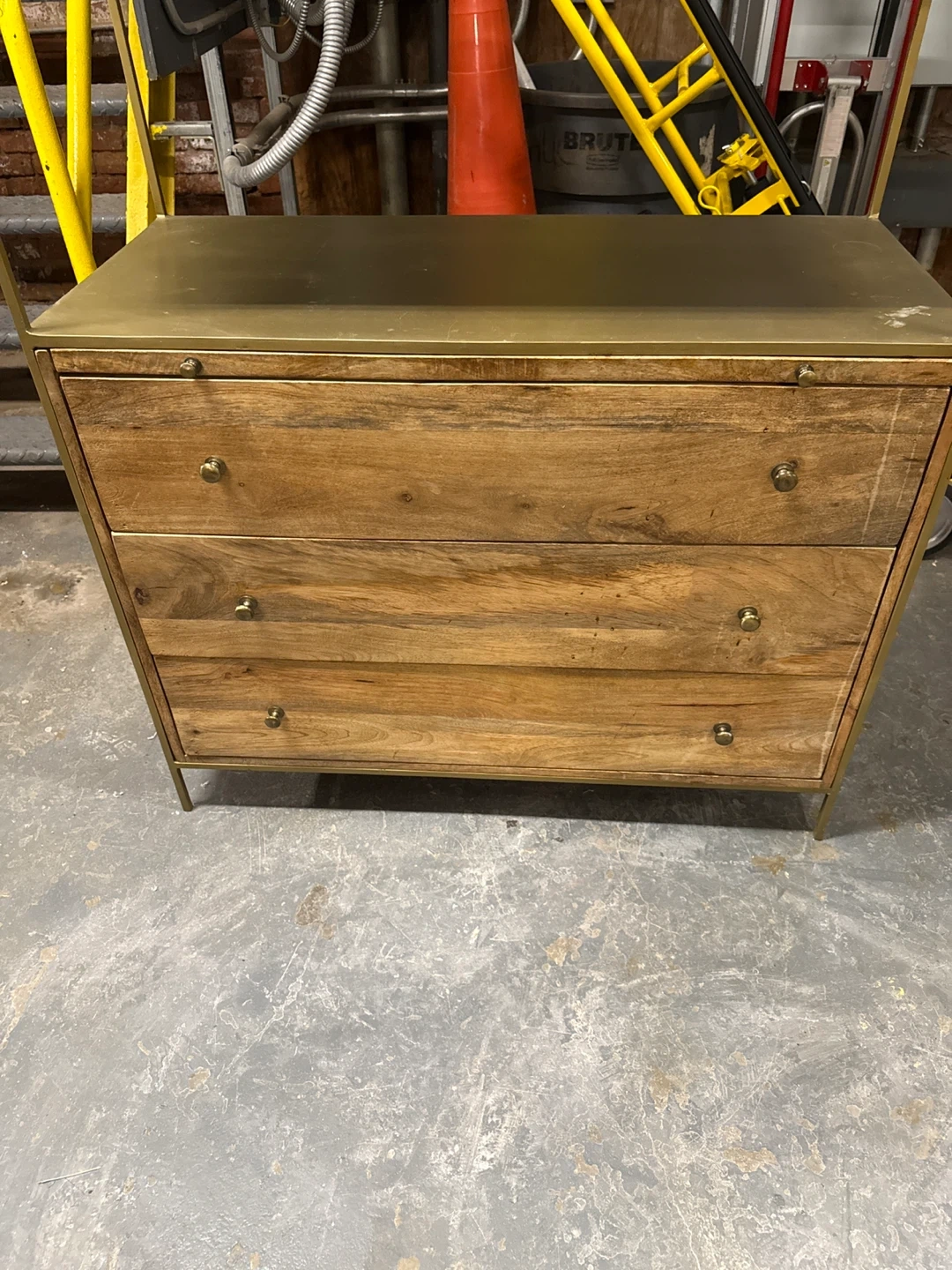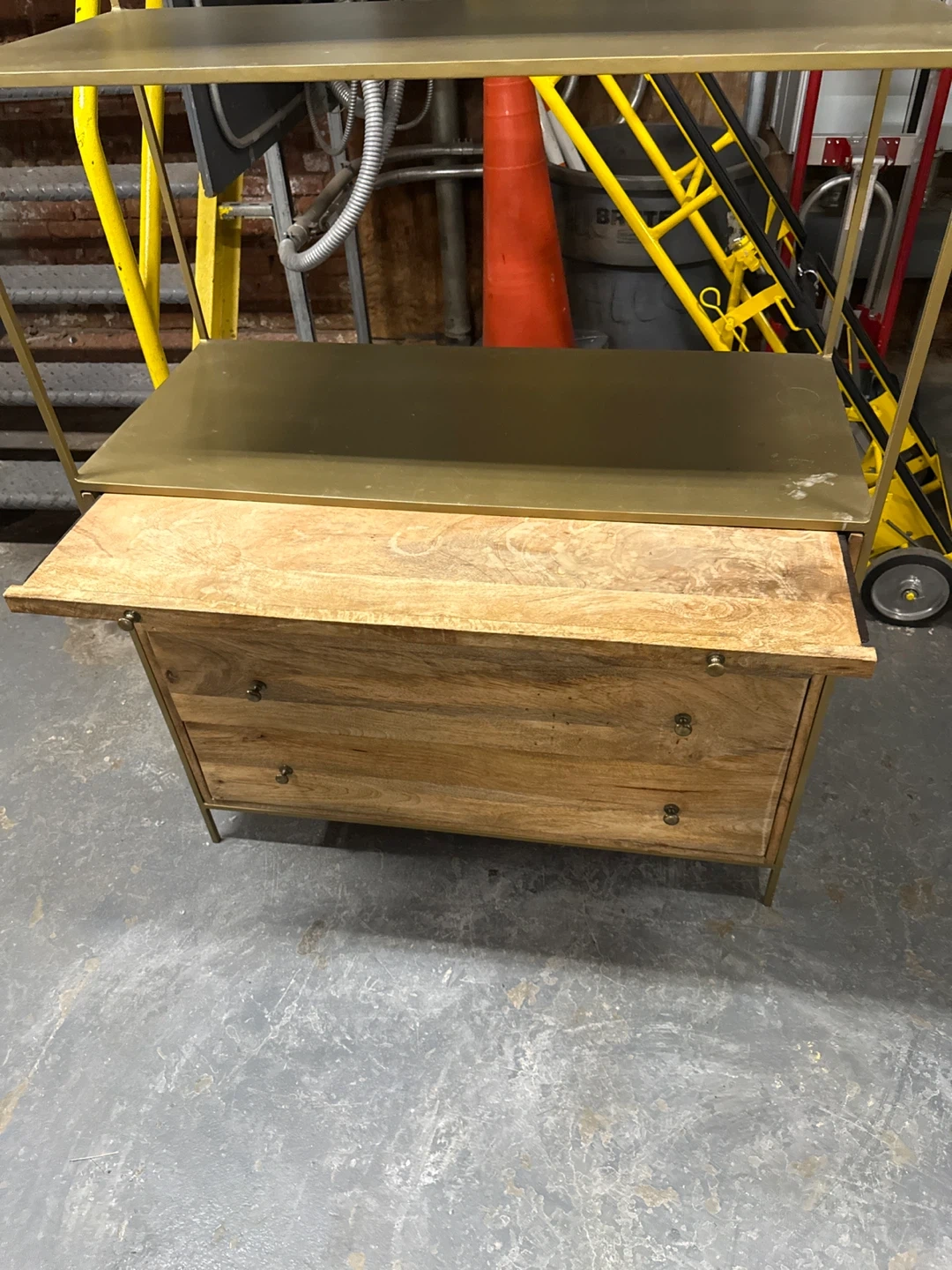 Selling a wood dresser with attached gold-colored shelving. It has three drawers and is in good condition. The shelving is perfect for displaying items or storing things you need easy access to! It's a unique piece that adds character to any room