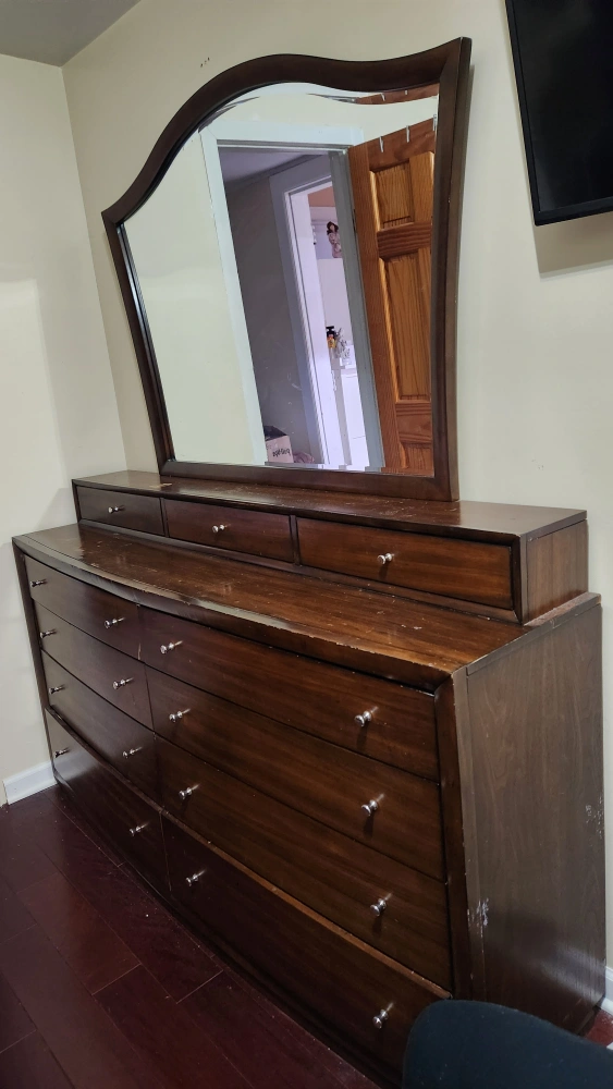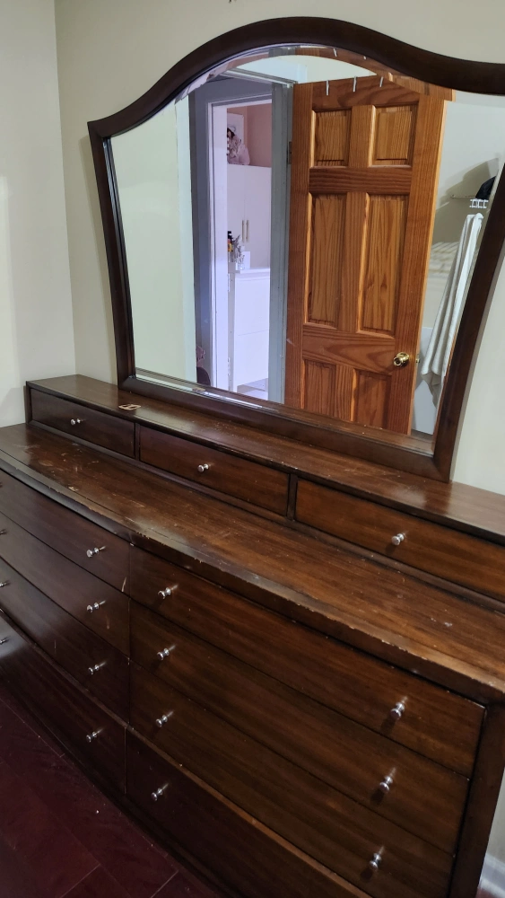 Selling a wooden dresser with a mirror. It's a great piece to add to any bedroom! It has multiple drawers for ample storage space. The dresser is a brown color.