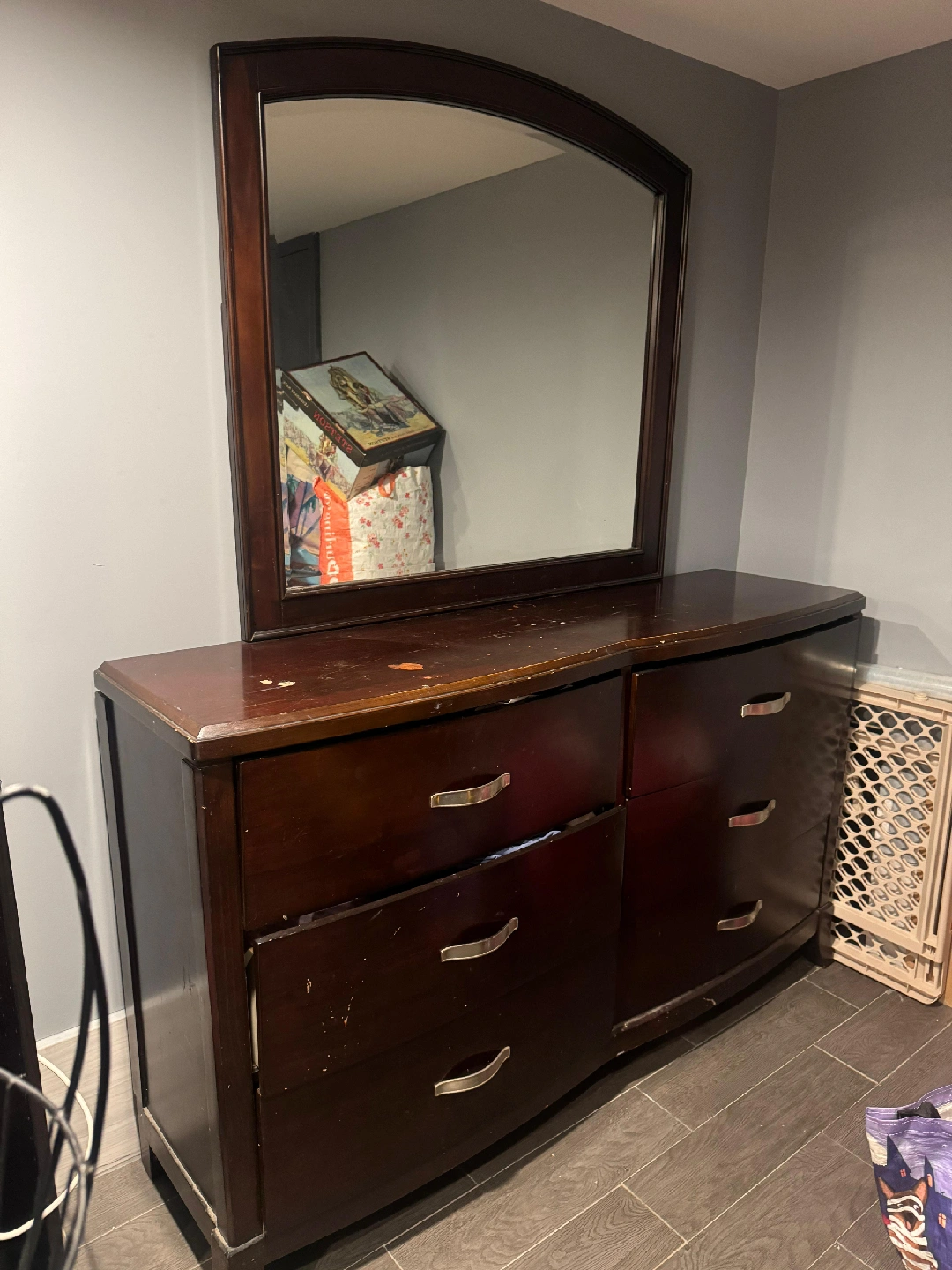 20(From Bob's ) Wood dresser with an attached mirror. It has some signs of wear and tear, as shown in the pictures. Still functional and has plenty of storage space. pick up 10/25/2025 Saturday. needs 2 person to carry out.