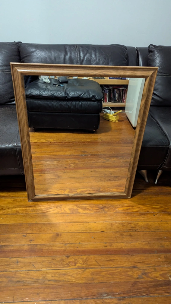 Selling a wood-framed mirror! The frame has a classic design and the mirror is in great shape. It's perfect for adding a touch of elegance to any room. Ready to give your space a little refresh?