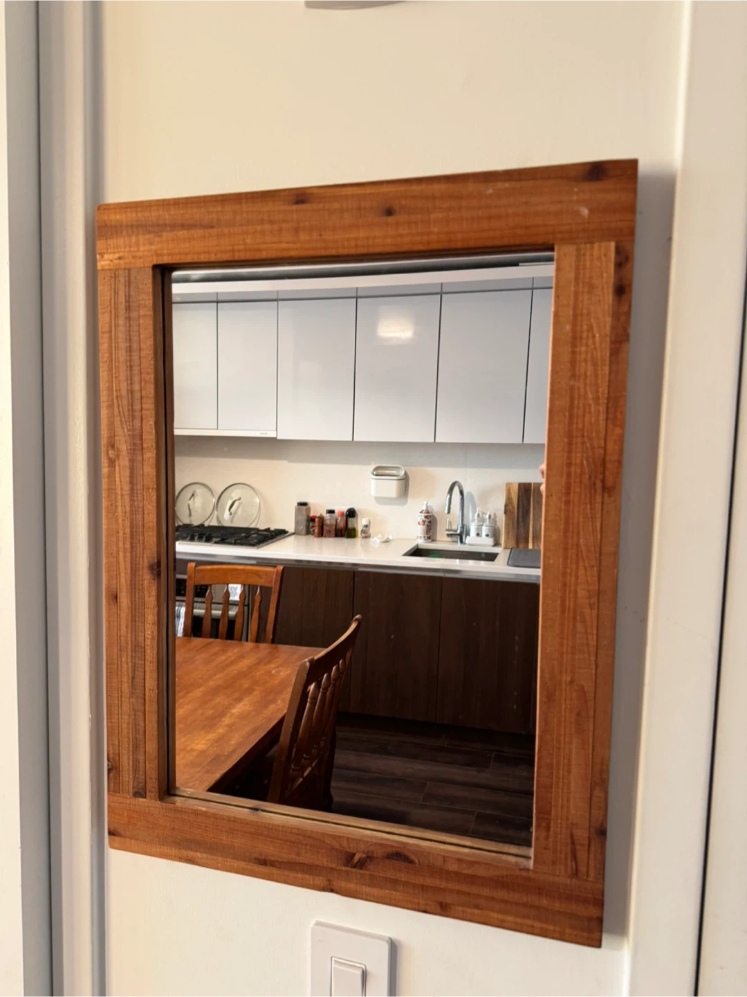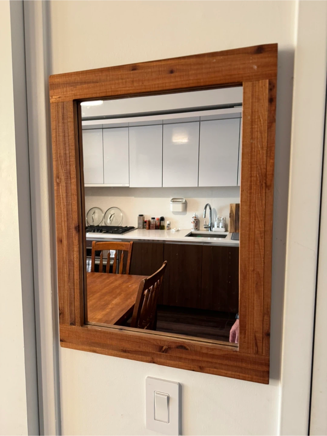 Selling a wood-framed wall mirror in great condition. It's a lovely piece that would great in any room! The frame has a warm, natural wood tone that adds a cozy touch