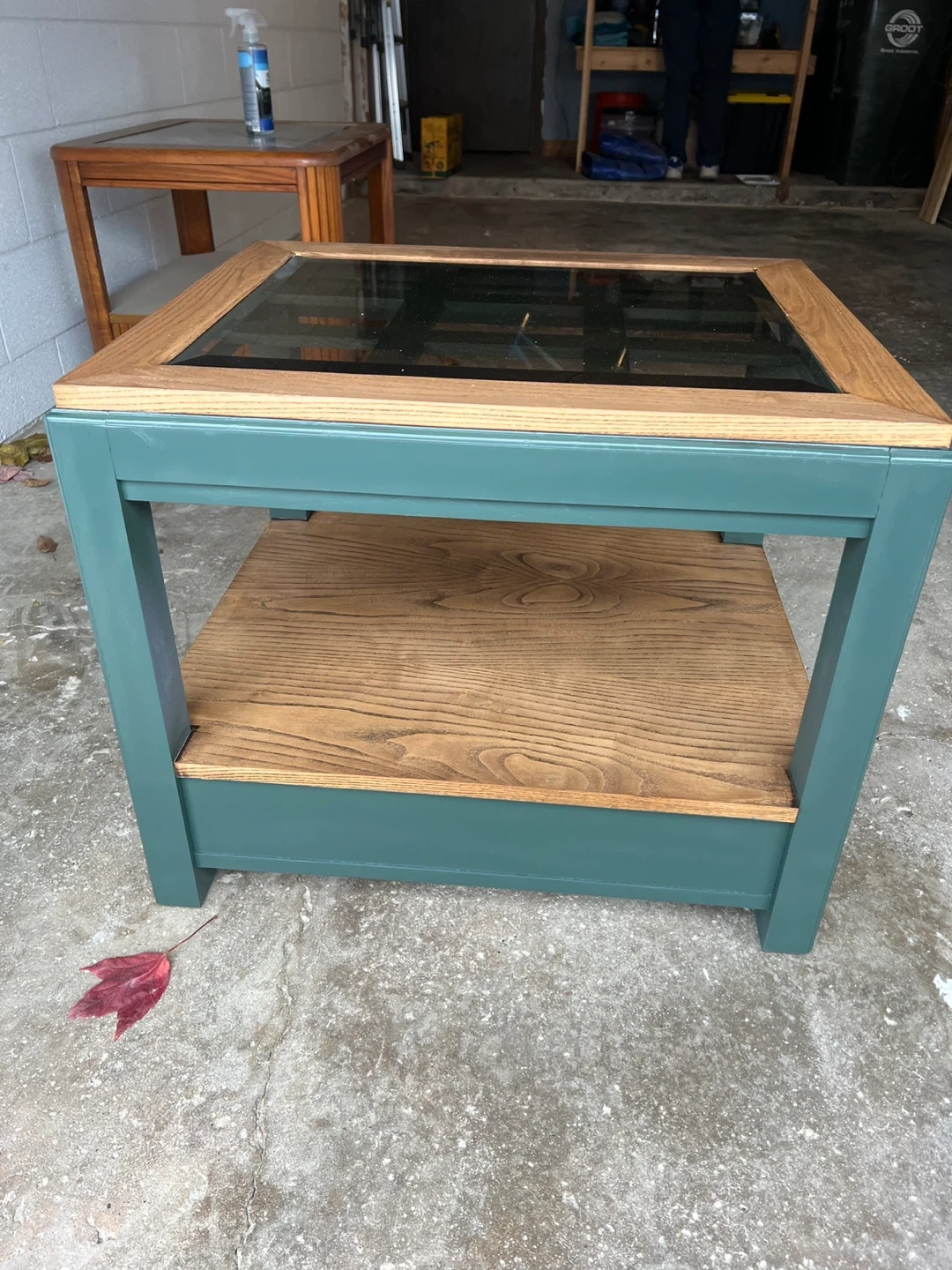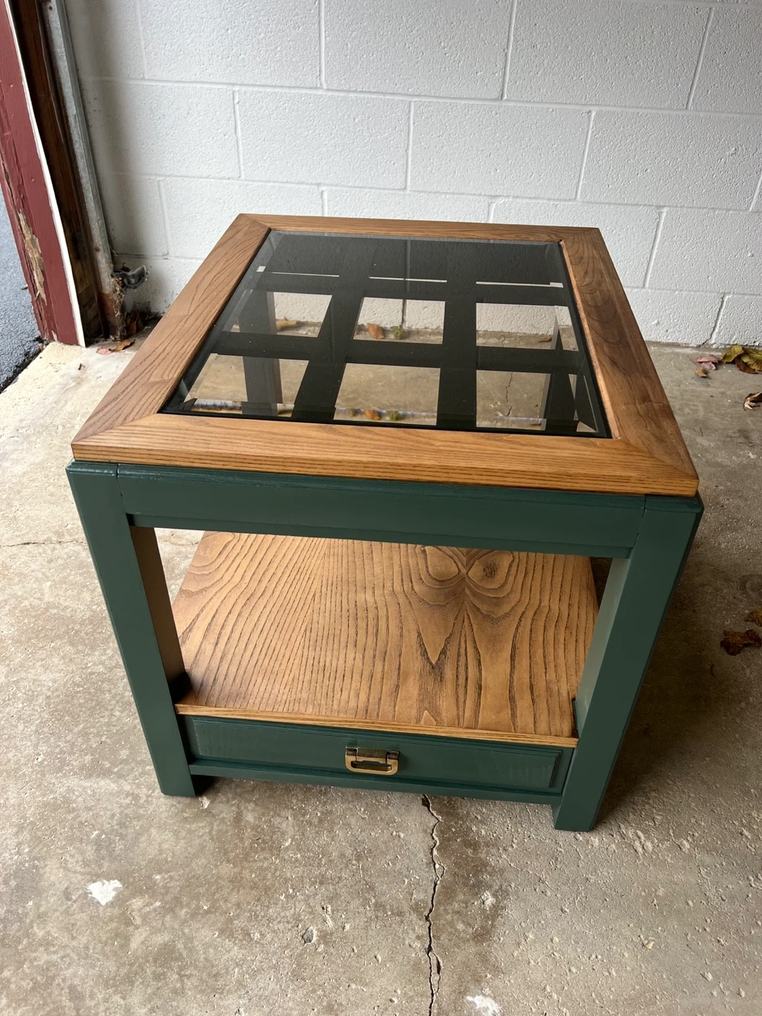 10This is a sturdy coffee table with a wood frame, a glass top, and a convenient shelf underneath. The frame is painted in a nice green color, and the wood grain is visible on the shelf and top trim. It also has a drawer for extra storage!